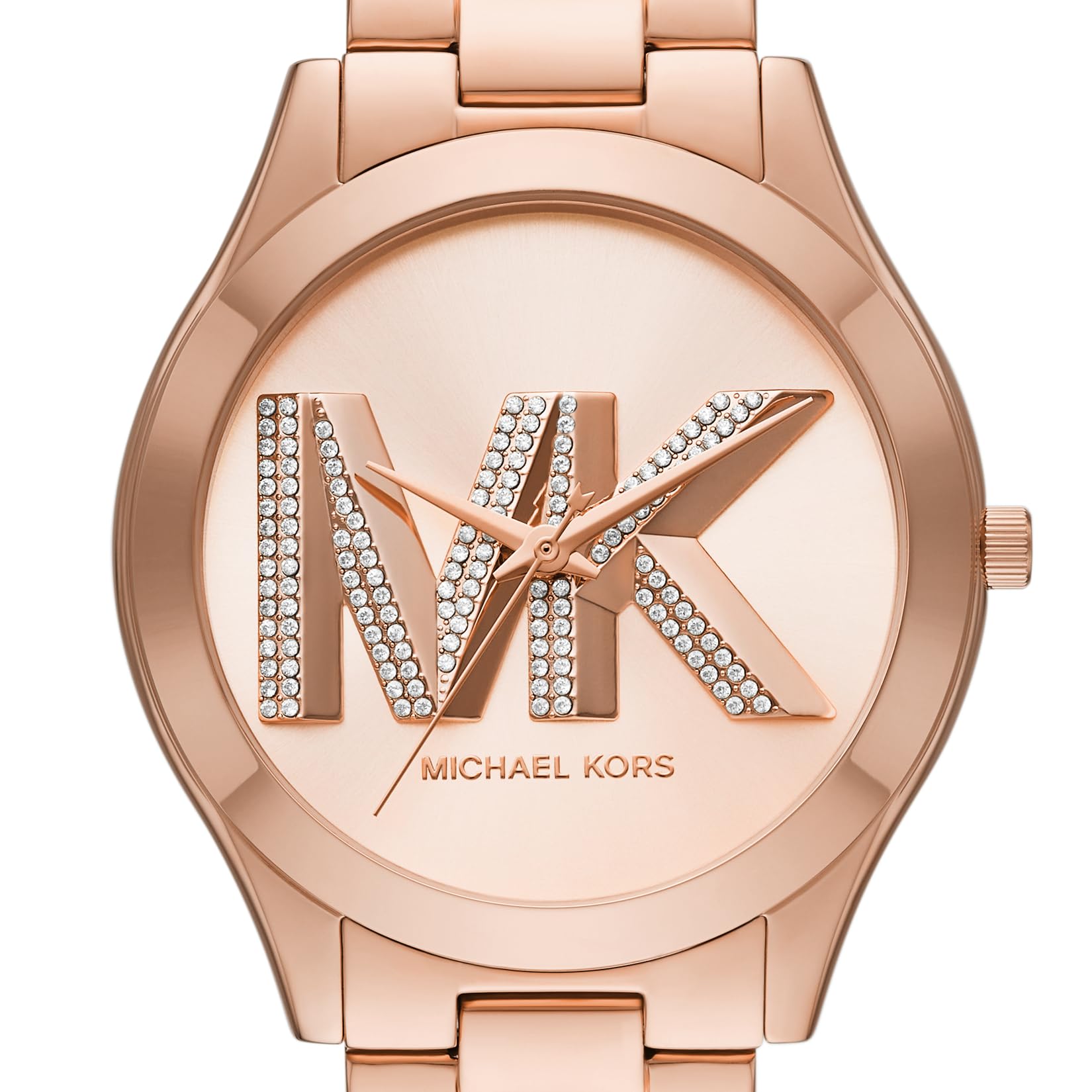 Michael Kors' 42mm Slim Runway watch features a rose gold pavé sunray dial, three-hand movement and rose gold-tone stainless steel bracelet.