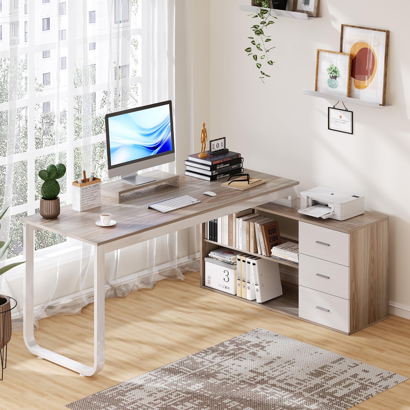 Plenty of Storage Space: Designed to suit all a home office's needs, the l shaped desk with drawers features 3 spacious drawers, two shelves. Drawer equip with 3-sections fold slides that ensure drawer slides smoothly and silently.Sewing table provides you with convenient storage for handmade parts