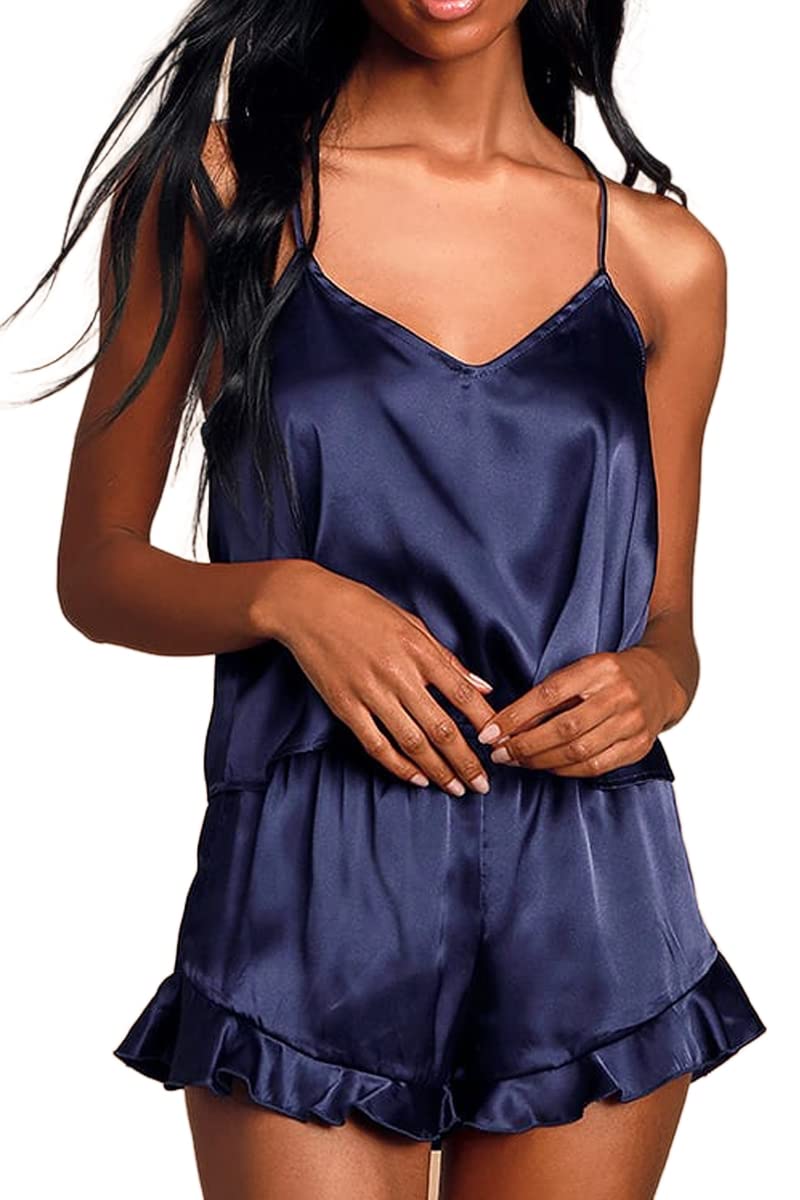 The cute satin silk cami pajamas tops features v neck,low cut,racerback,adjustable straps,the shorts features high waisted,elastic waist,casual loose style.The cute and sexy pajamas sets will make you look more flattering,elegant for your sweet night.