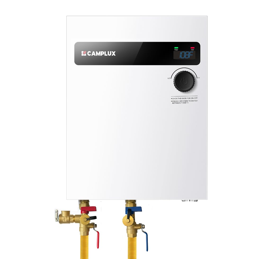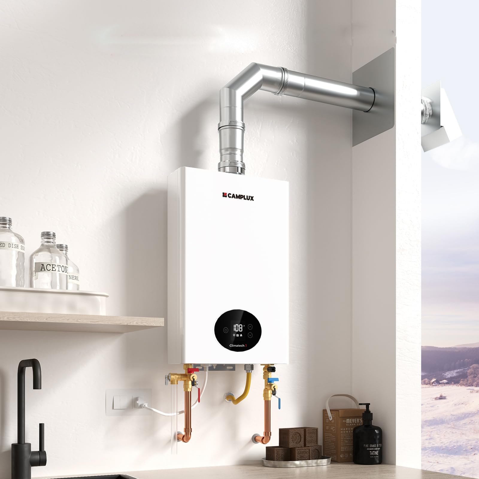 Compatibility, idea for most gas and electric tankless water heaters, water output, input 3/4", also suitable for CAMPLUX Tankless Water Heater CX264WLP, CX264WNG, CX360WLP, CX360WNG, CX422WLP, CX422WNG, CA528WLP, CA528WNG, CA686WLP, CA686WNG, TEW18, TEW24, TEW27.
