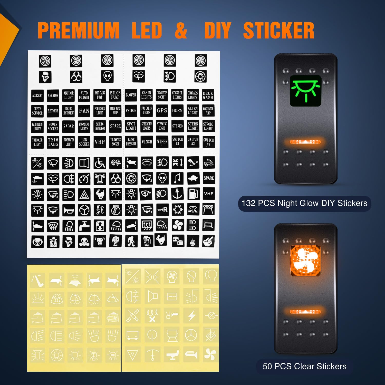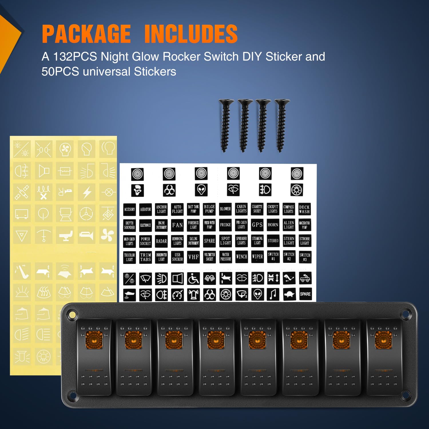 Premium LED & DIY Sticker: Our rocker switches have 2 orange LEDs, they can illuminate and help you to find the switches in the dark easily, and you still can assign your switches as your needs with the DIY sticker, they will give you a good experience.