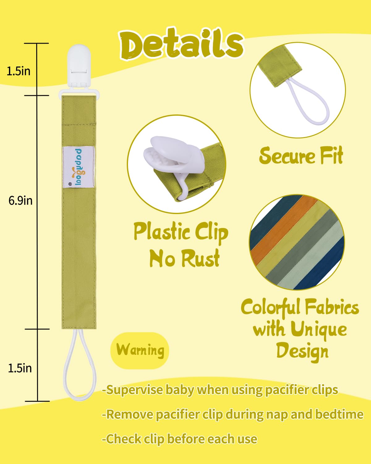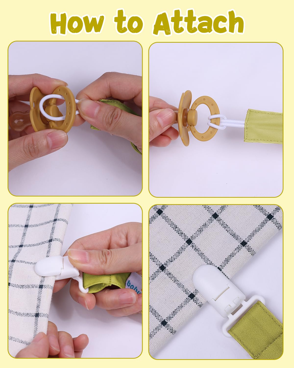 Multifunctional Usage: These pacifier leashes are usually used for soothies, teethers,burp cloths, teething rings and blankets, drool bibs. It is an universal pacifier clip and fits to your favorite brand of pacifier and soother.