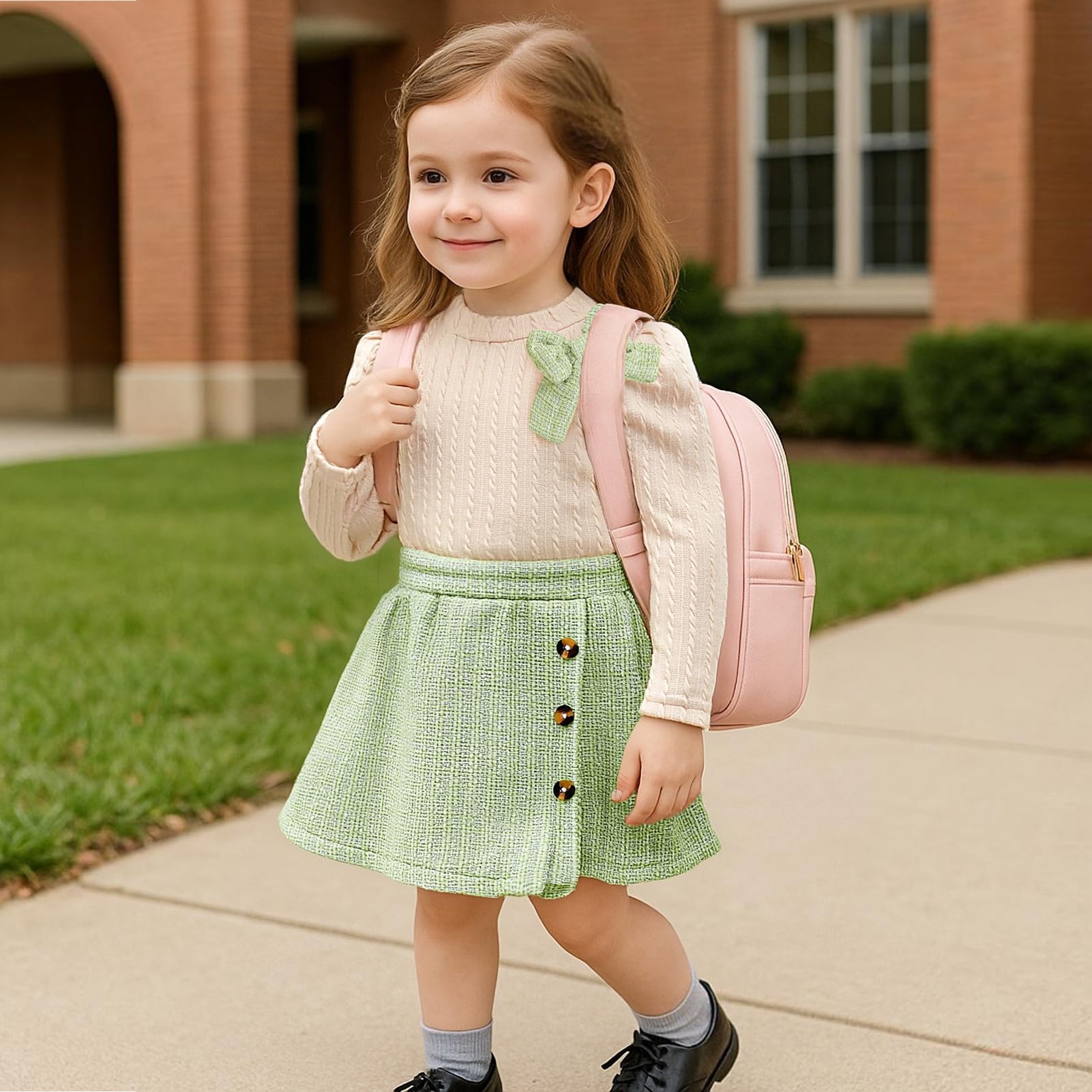 Design: Kids Little girl spring fall winter skirt set,knitted cotton long sleeve solid color top, button mini skirt with elastic waist , winter fashion warm toddler girls clothes outfits.