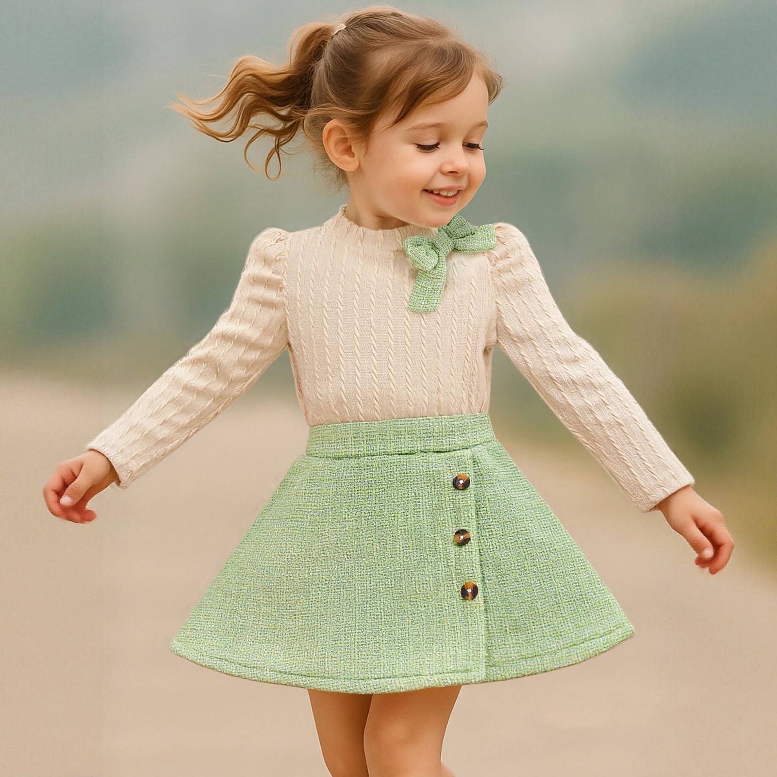 MATERIAL: Toddler girl shirt sweater top is made of cotton and polyester, bottom skirt is made of cotton blend and polyester, soft, breathble, and comfortable, sweet toddler baby girl 2 piece skirt set, cute baby girl clothes.