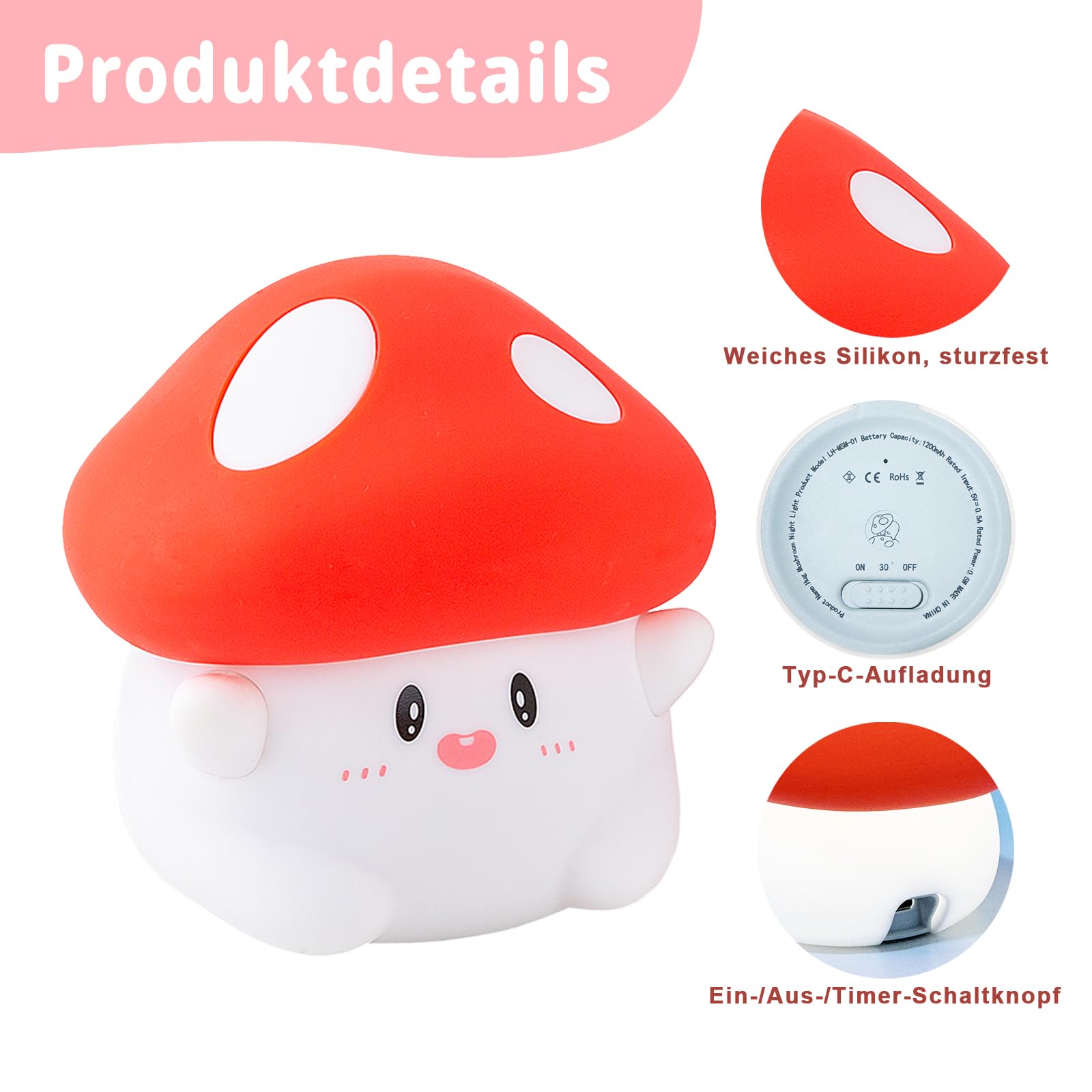 BPA-free: Mushroom Night Light is made of safe and non-toxic food-grade silicone. As a touch-controlled baby night light that comes into contact with the body every day, we use the highest grade food-grade silicone that is BPA-free. Soft silicone can be kneaded freely and springs back quickly. The silicone exterior is thickened to prevent easy breakage or damage. It can be your stress reliever instantly. It is a baby night light and a stress relief toy.