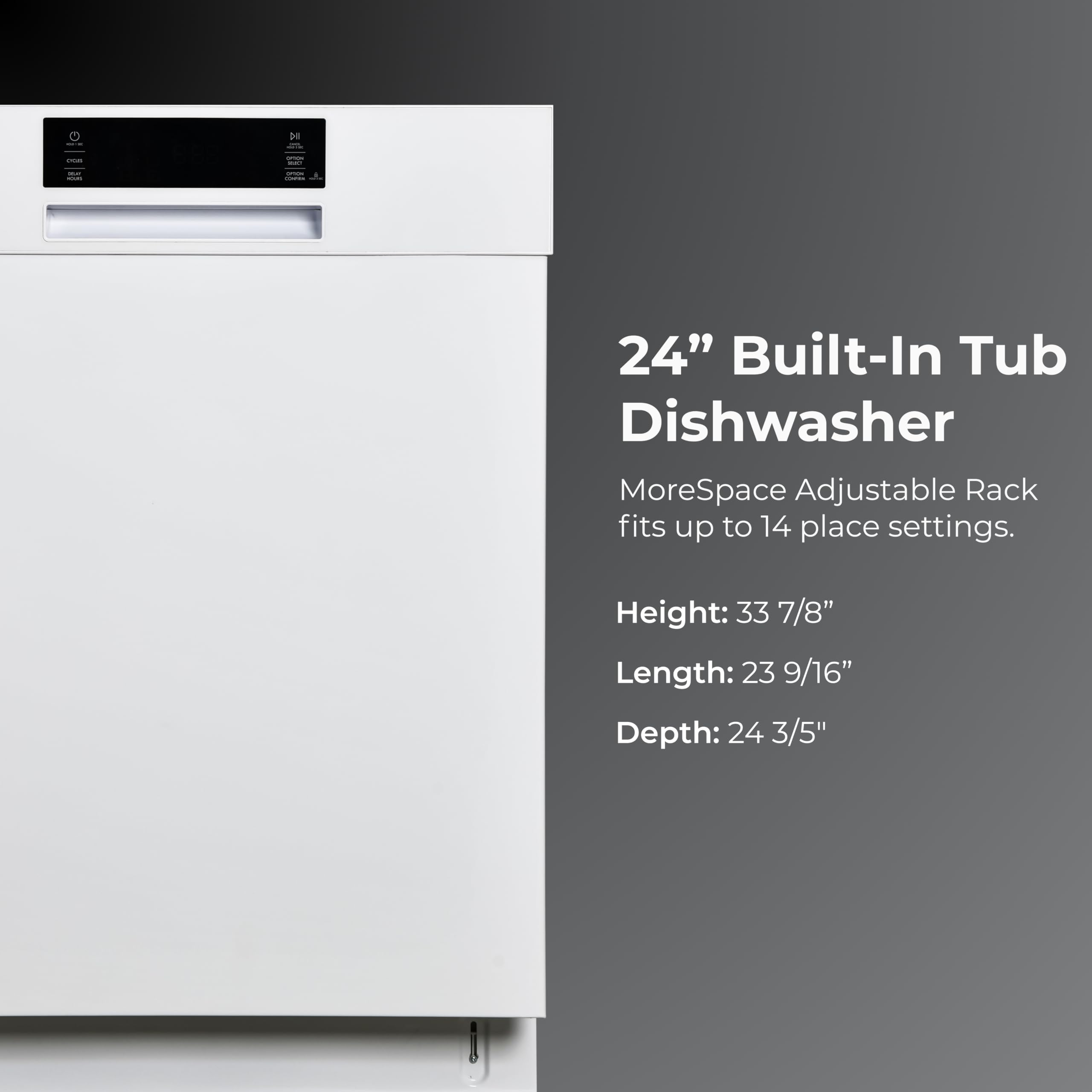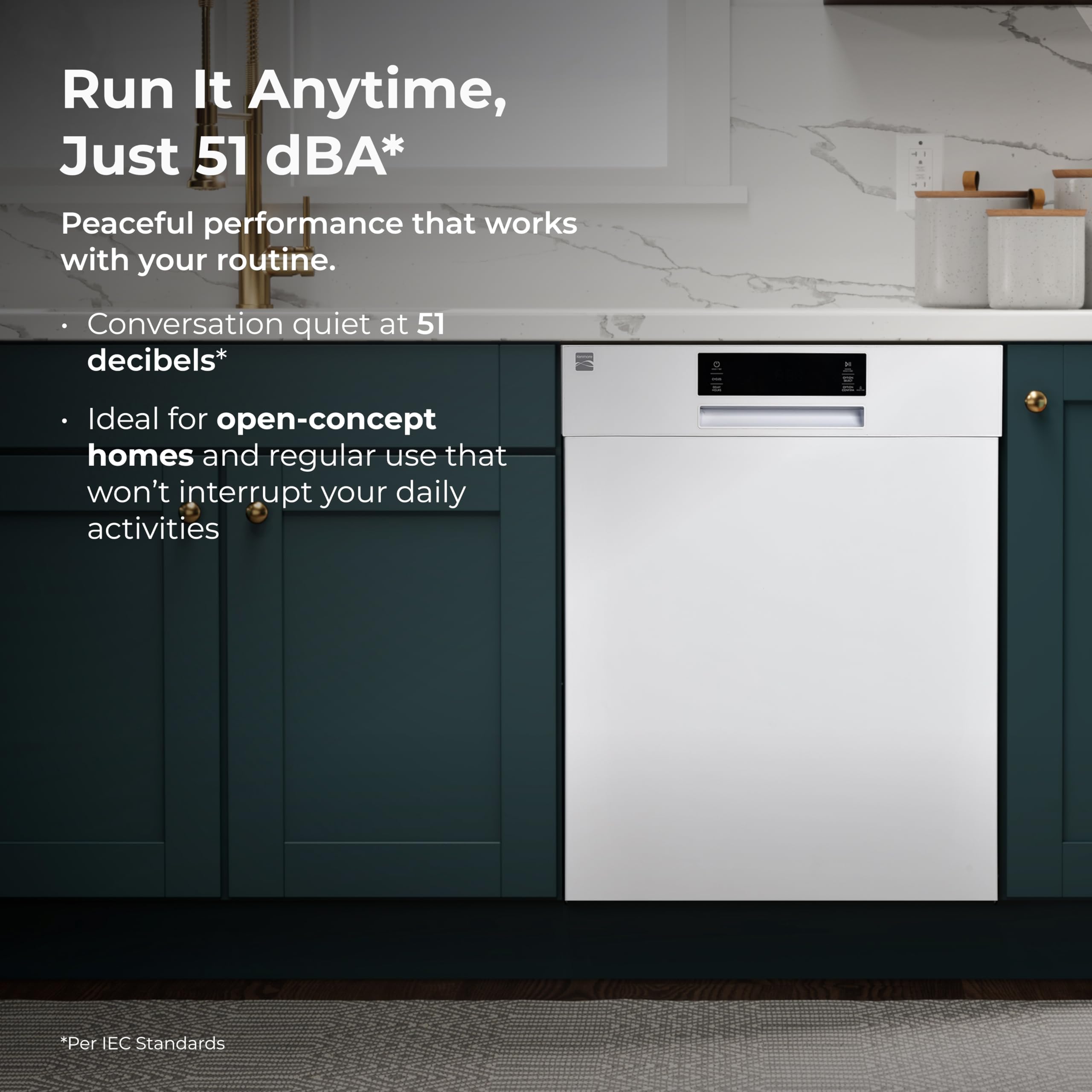 Get the cleaning power your dishes need with the Kenmore Built-In Dishwasher. This 24" dishwasher makes it easy to get the right wash for your load every time with the SmartWash Cycle, which detects the amount of soil in the water and automatically adjusts the temperature, amount of water, and duration of the wash accordingly. Featuring the UltraWash system, this dishwasher uses two spray arms to clean from every angle while constantly filtering the wash water throughout the cycle. Paired with SmartDry technology, it uses hot water to promote the condensation of moisture in the tub for sparkling clean and dry dishes at the end of the cycle. The Extra Dry option boosts heat and drying time for plastics and other hard-to-dry items. To help prevent issues during a cycle, the Leak Detect System measures and monitors water flow at multiple points. If a problem is sensed, the dishwasher will automatically drain the tub and alert you when necessary. The 3-stage UltraWash Filter captures food particles as small as a grain of sand and removes them from the cycle, preventing debris from landing back on your dishes. Functional and flexible, this dishwasher includes Delay Start, so you can run a cycle 1 to 24 hours later—perfect for off-peak hours or when you’re not home. The Express Cycle gets a full load clean in just 50 minutes, helping you save time when you need dishes fast. With space for up to 14 place settings, a stainless steel tub that resists food stains and retains heat, and Energy Star certification to help you save water and energy each cycle, this dishwasher is a smart, stylish addition to any kitchen.