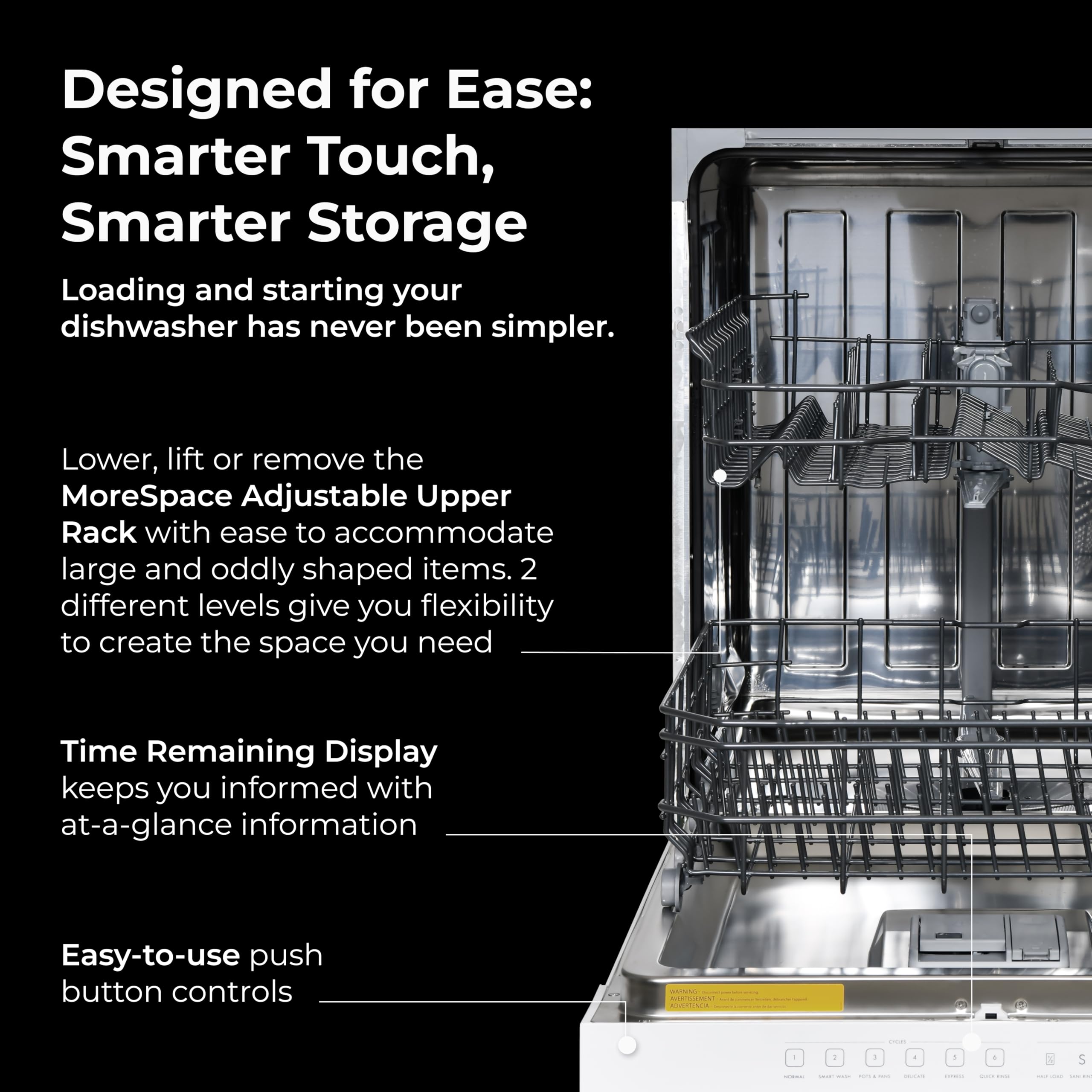 Roomy Interior & Adjustable, Removable Rack: Fit up to 14 place settings or just a few items using the Half Load option. The MoreSpace Adjustable Upper Rack raises, lowers, or removes entirely to make room for pots, tall items, or delicate stemware