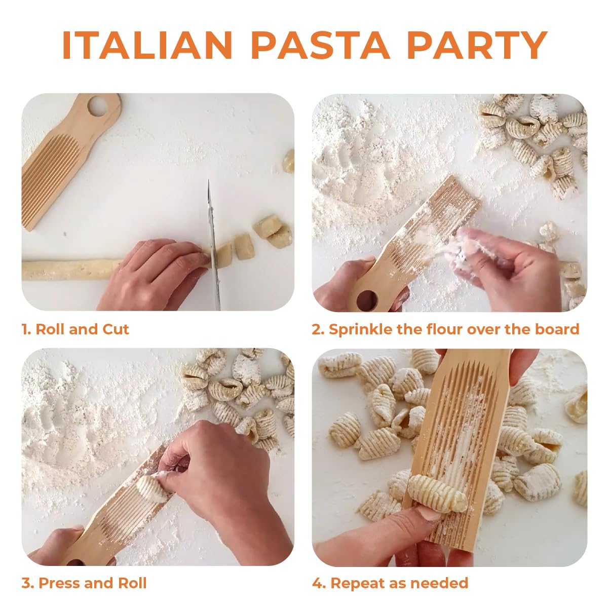 BOARD: Our gnocchi board is the perfect tool for making traditional Italian gnocchi at home. The board is made of solid wood, it has a grooved surface that helps to create the perfect ridges on the gnocchi, giving them the traditional texture and appearance.