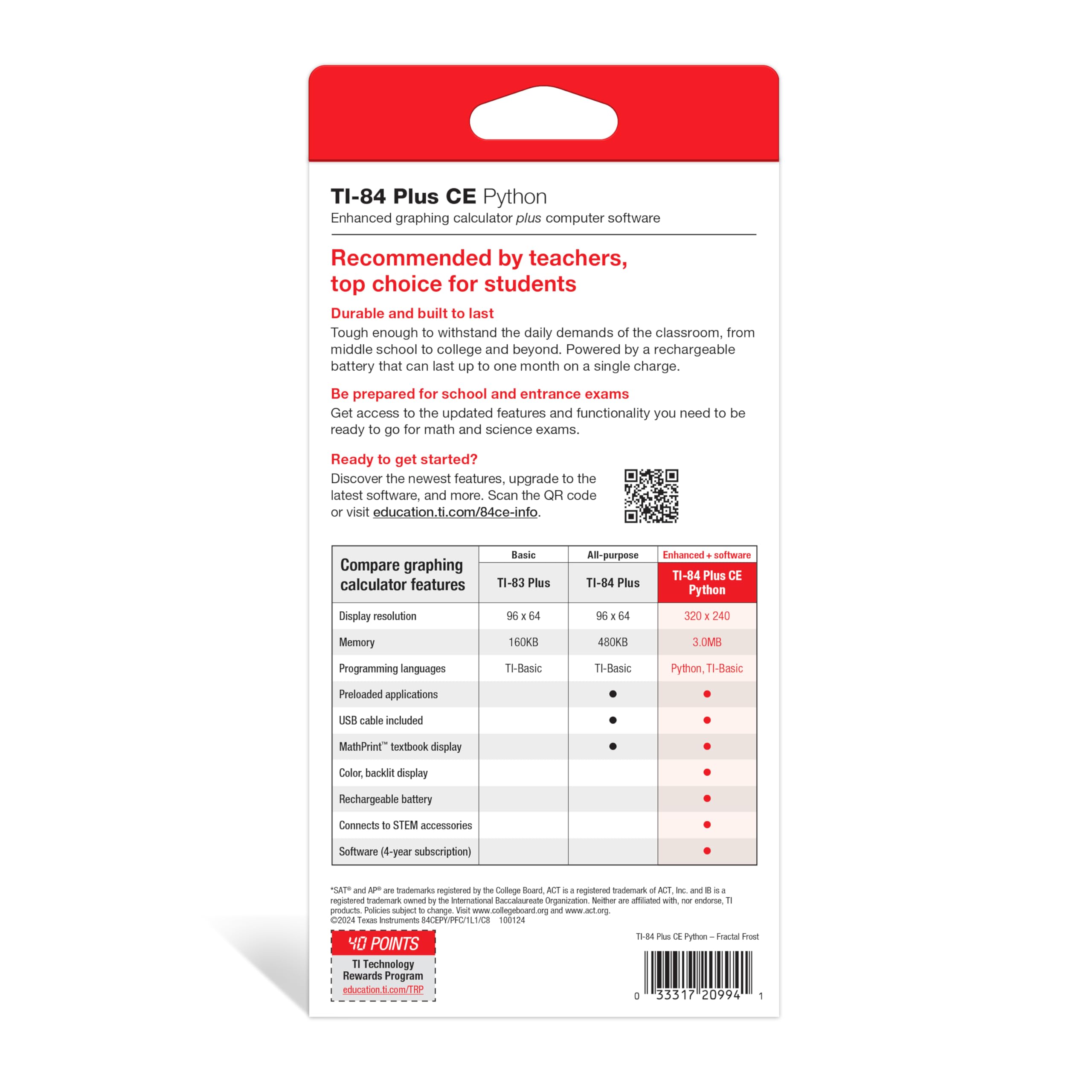 The TI-84 Plus CE Python graphing calculator makes understanding math and science topics quicker and easier. Ideal for middle school through college. A 4-year subscription for the TI-84 Plus CE online calculator is included with retail purchase.