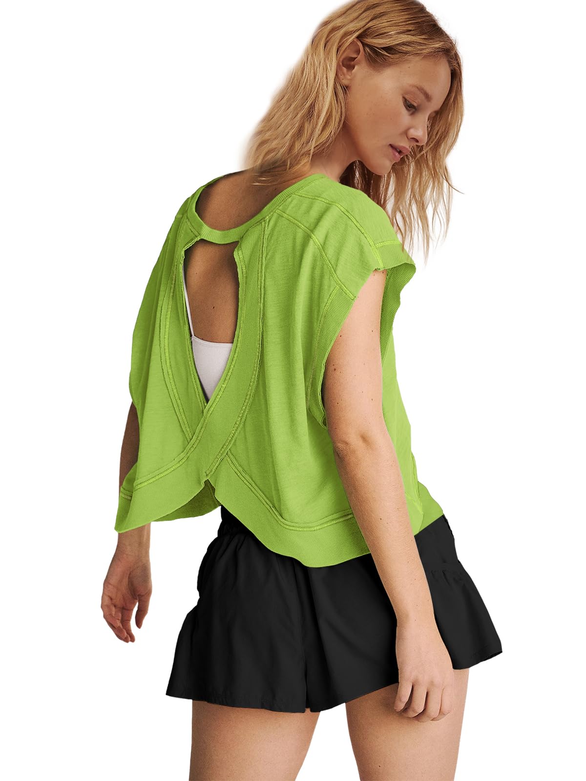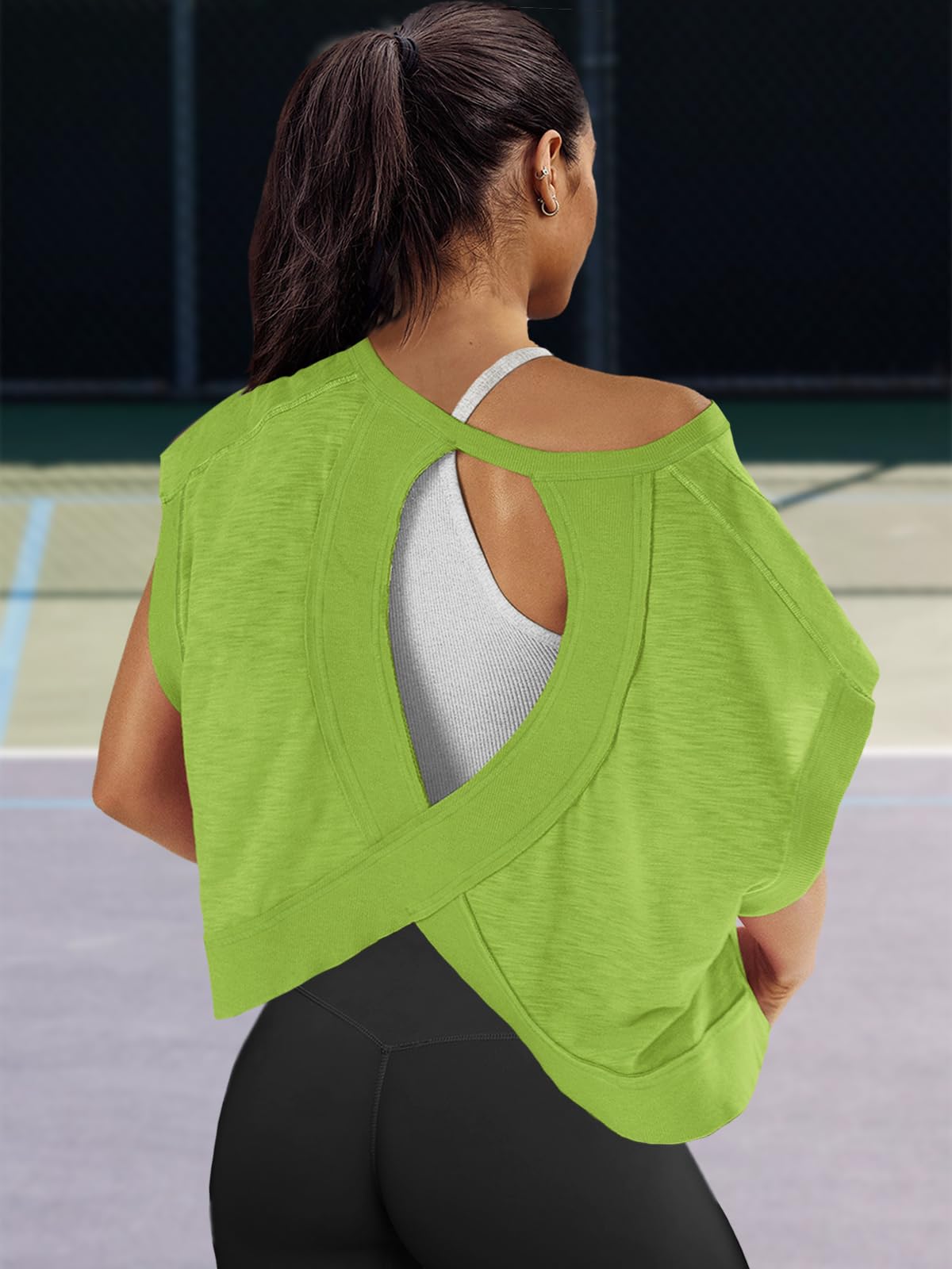 Fit: Please order your regular US size. The workout tshirts for women is an oversized style that not only flatters your figure but also pairs effortlessly with any outfit. If you want a more comfy loose fit for this womens open back tops, suggest ordering one size larger.