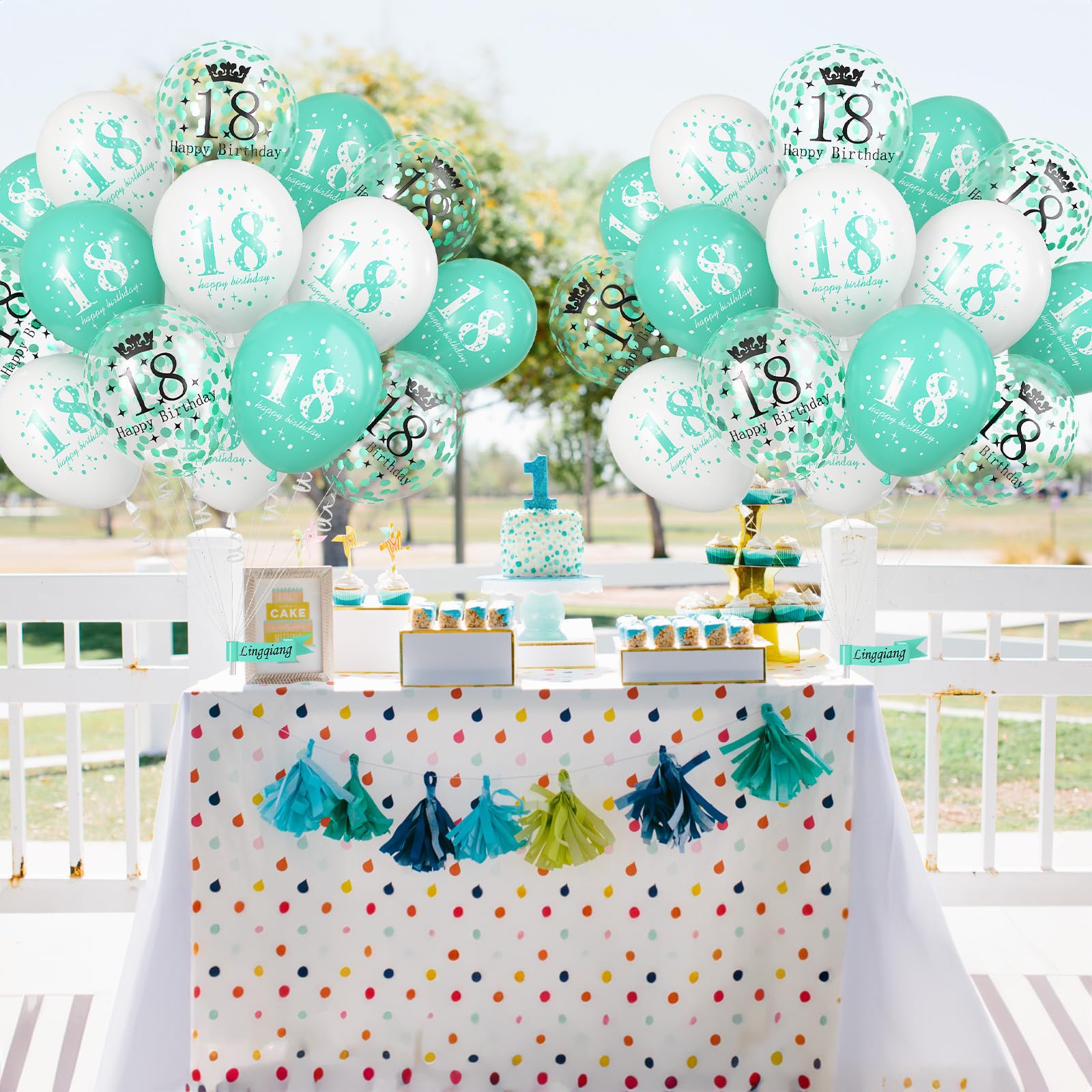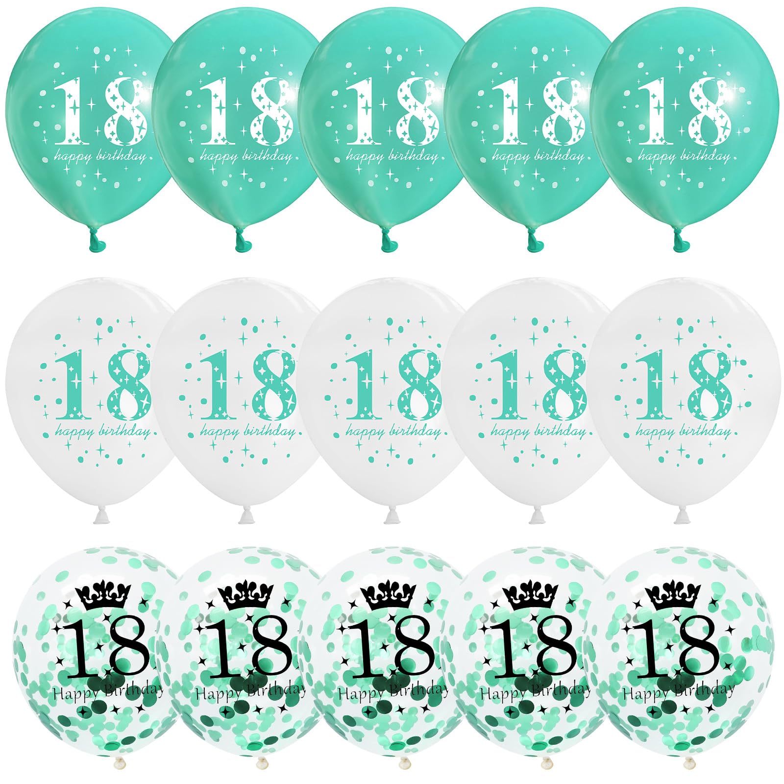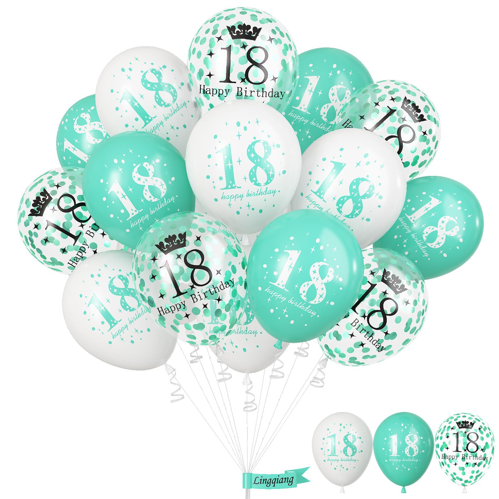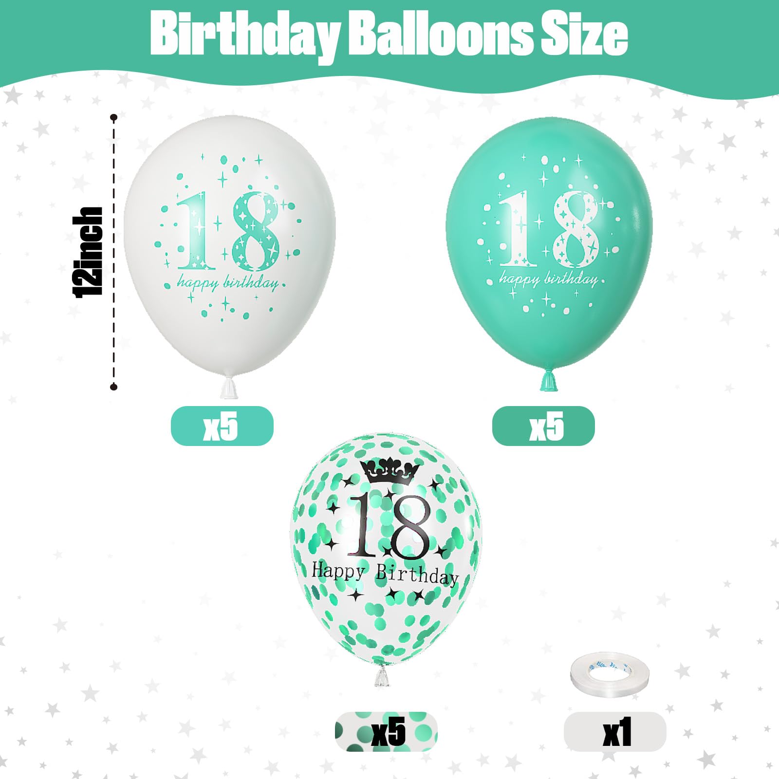 🎂 18th Birthday Balloons - You will get total 15 pieces 12 inch teal white happy 18th birthday latex balloons, inclulde 5 pcs turquoise print balloons, 5 pcs white print balloons, 5 pcs teal confetti print balloons, come with a balloon ribbon. Perfect for girls boys 18th birthday party decorations supplies.