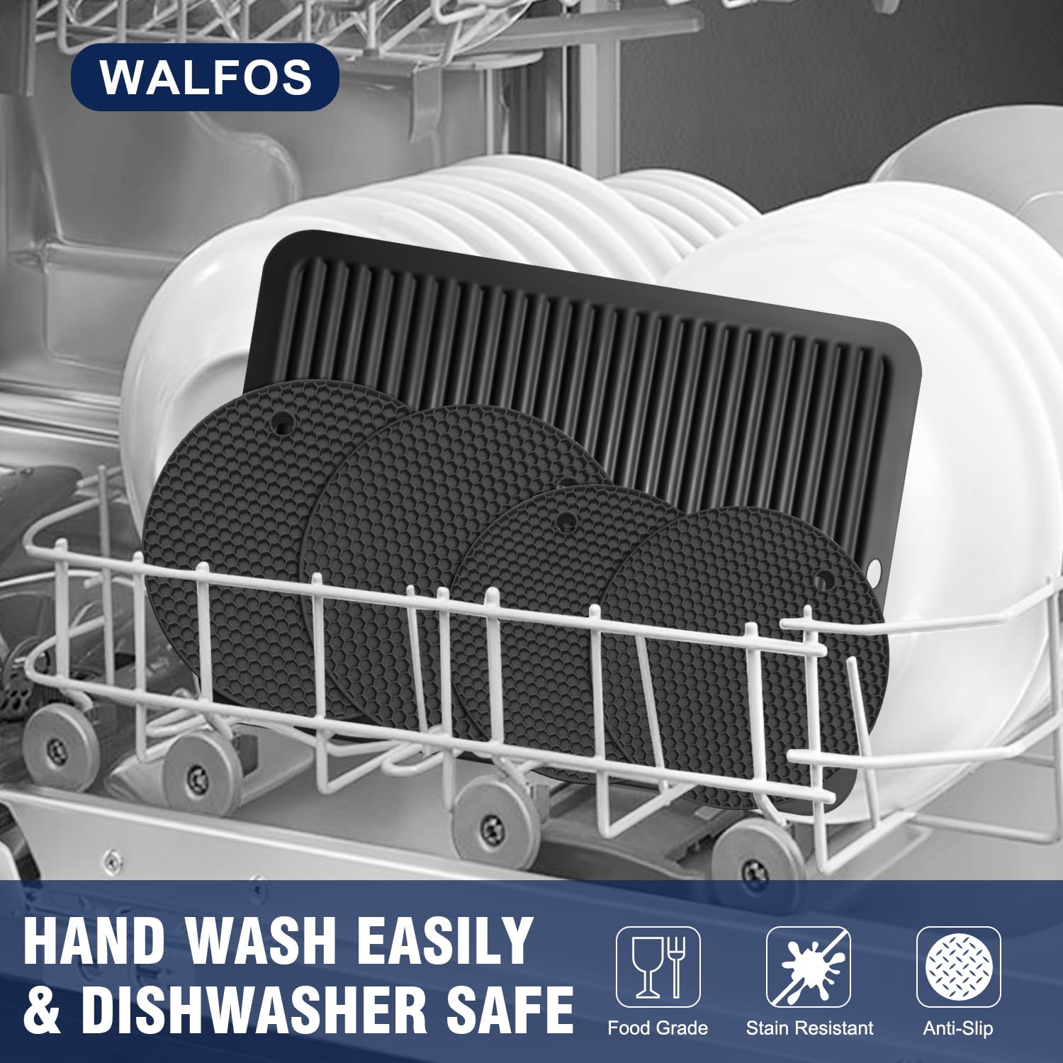 Walfos Silicone Trivet Mat have many advantage. √Food Grade silicone,. √Heat resistant up to 446°F. √Will never melt, discolored, or shrink. √Easy to clean and dishwasher safe. √Dry fast with no residue