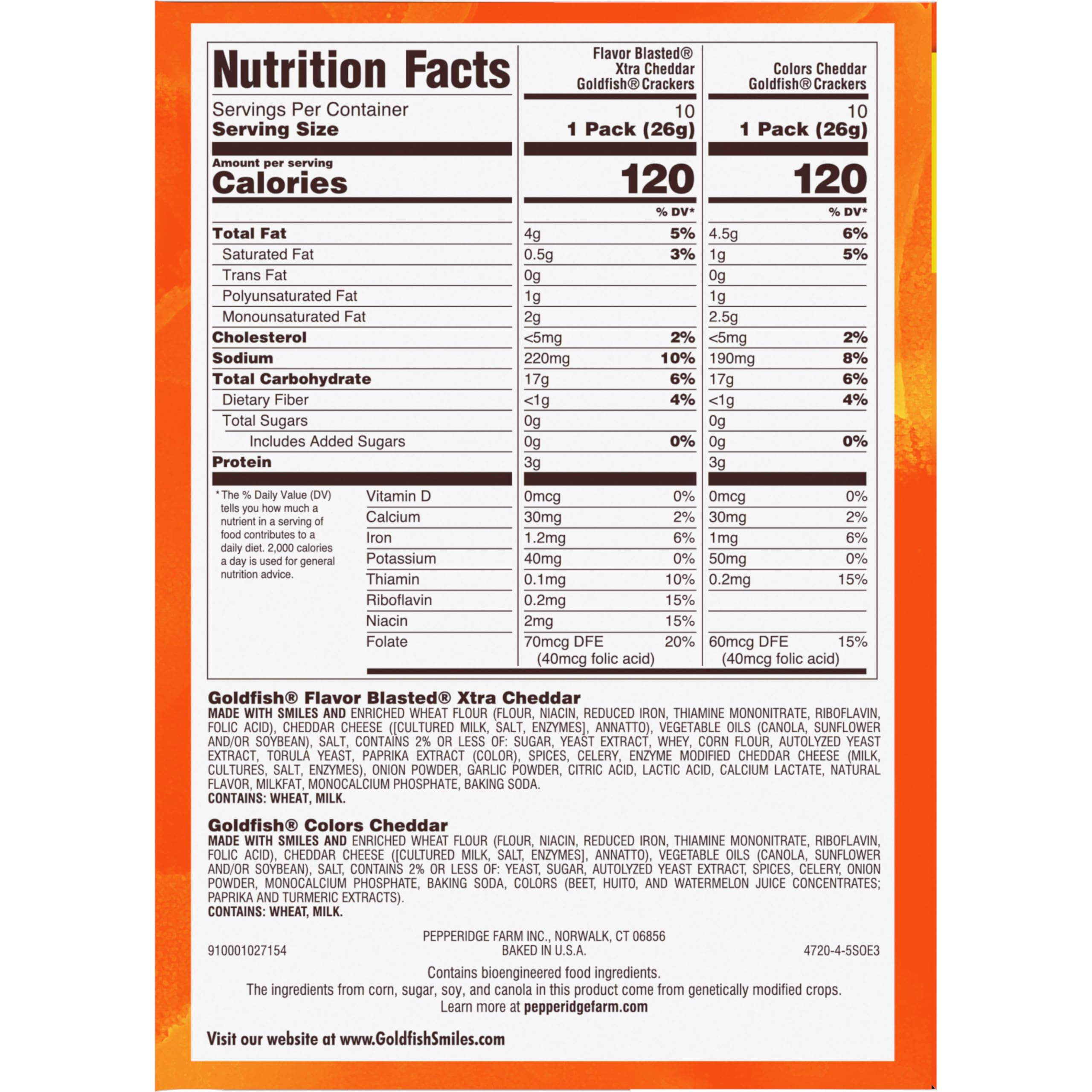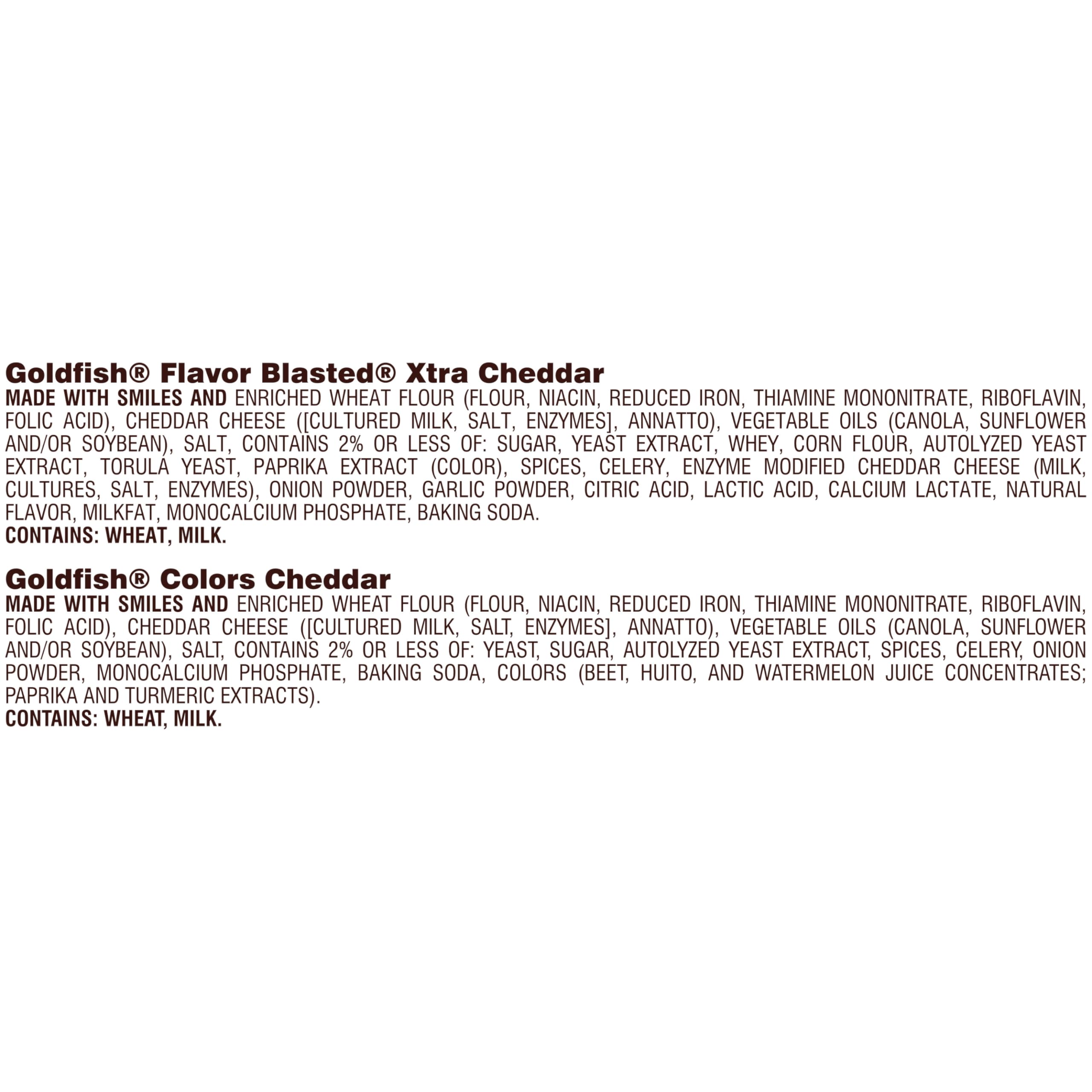 Variety pack includes: 10 single-serving packs of Goldfish colors and 10 packs of Goldfish flavor blasted xtra cheddar crackers