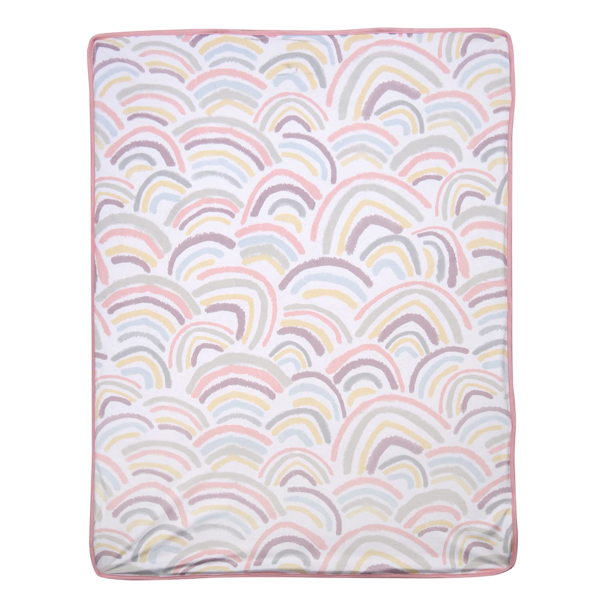 Add a splash of color with this soft and cozy baby blanket designed with hand-drawn rainbows. The front is a luxuriously soft minky and the back is a cozy polyester fleece faux shearling. Colors include pink, purple, gray, yellow, blue, and taupe. This makes a lovely baby shower gift or welcome home baby gift.