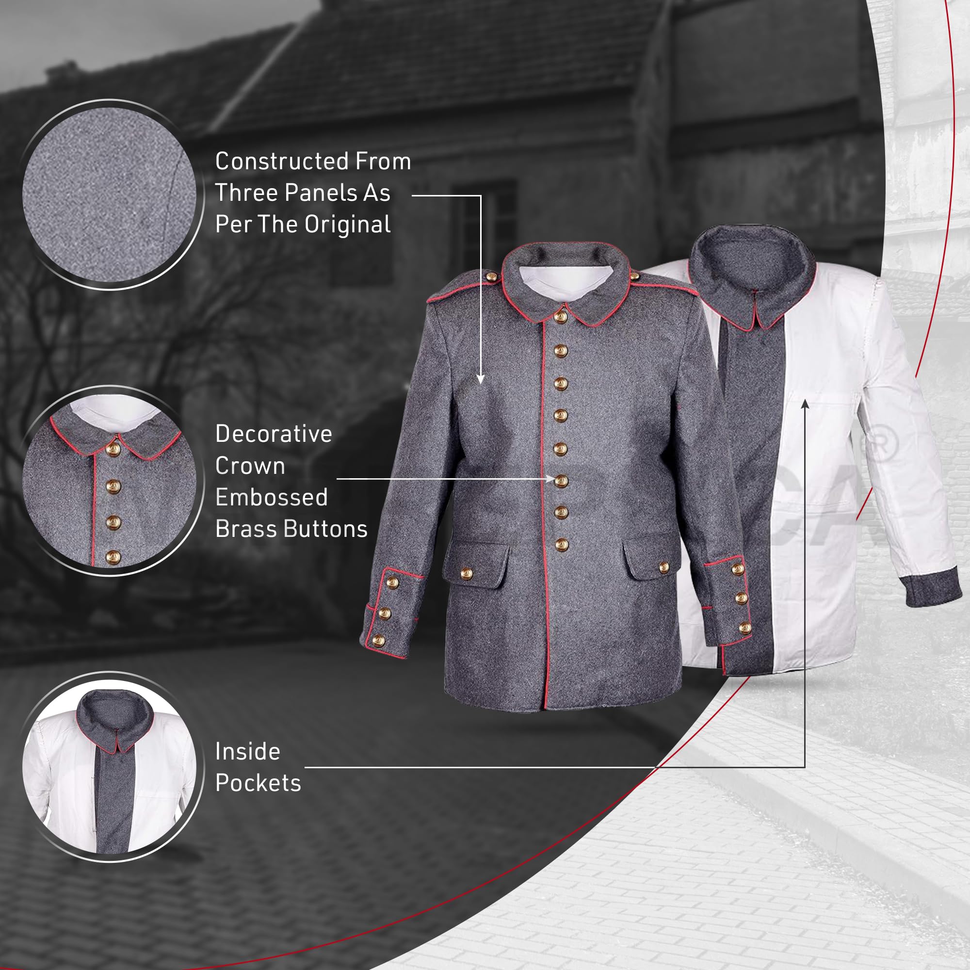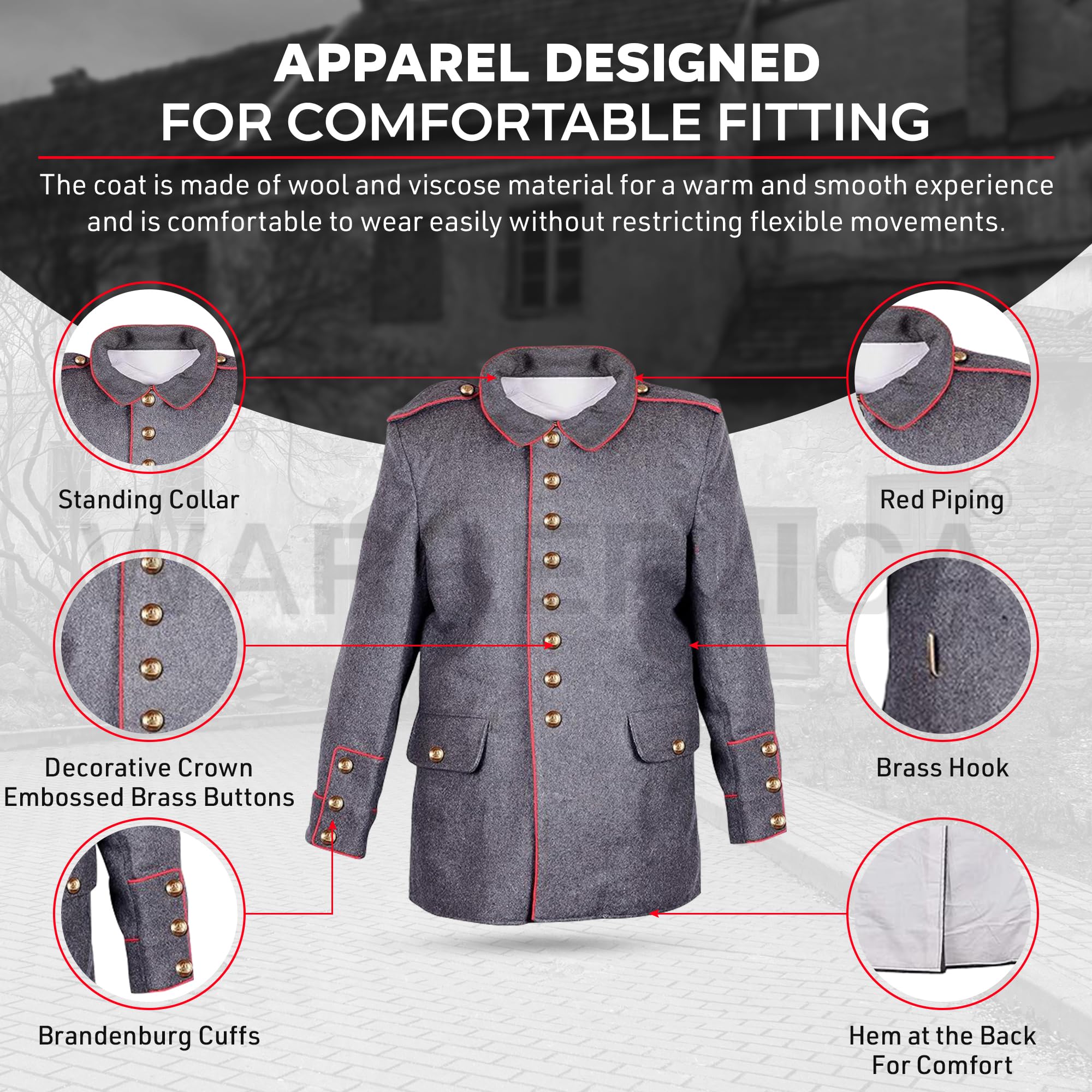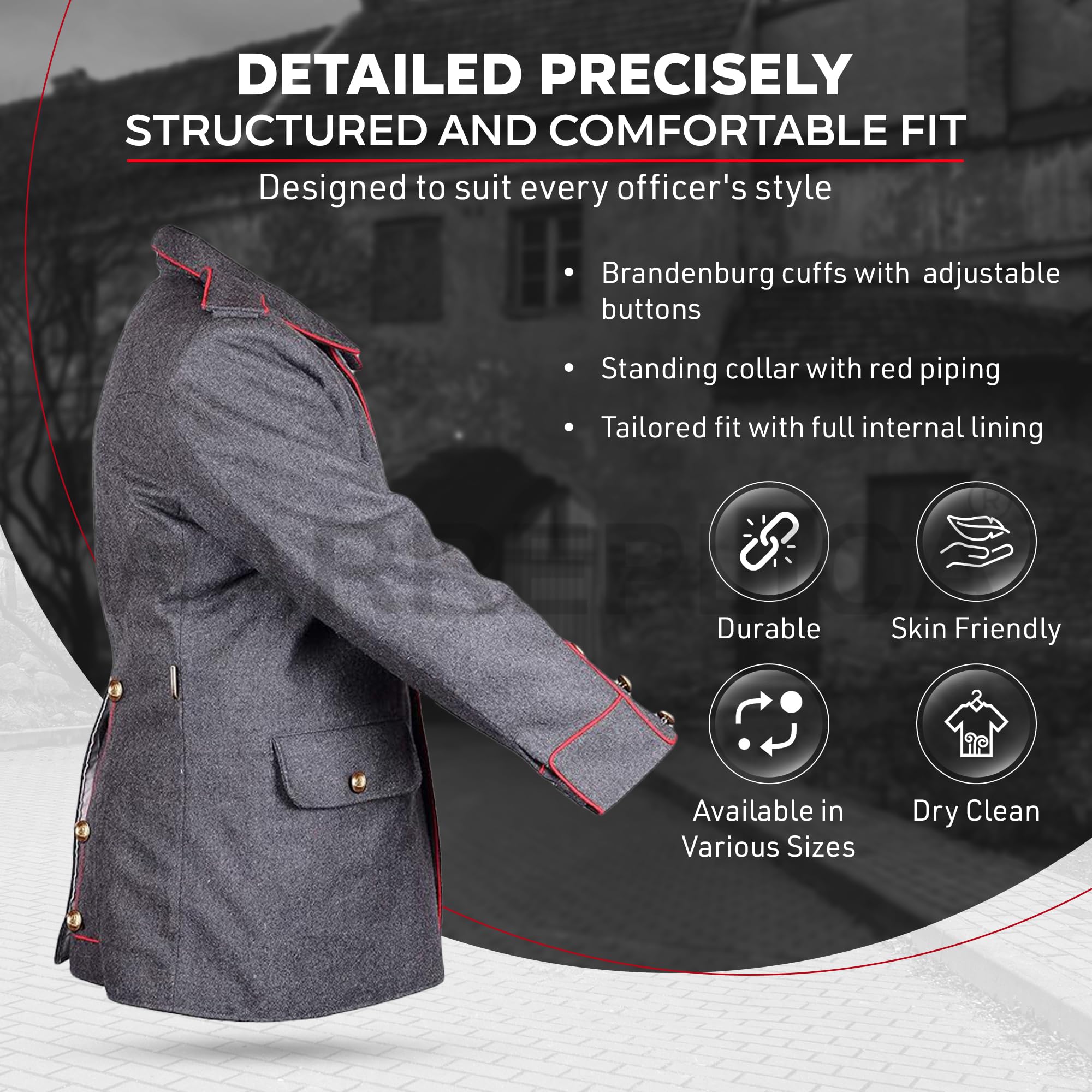 Color: The Coat is made of Field Grey color. They are piped in Red, with piping around the standing collar, on the front, on the Brandenburg cuffs and the rear skirt of the tunic. The Waffenrock is fully lined with white cotton cloth for extra comfort.