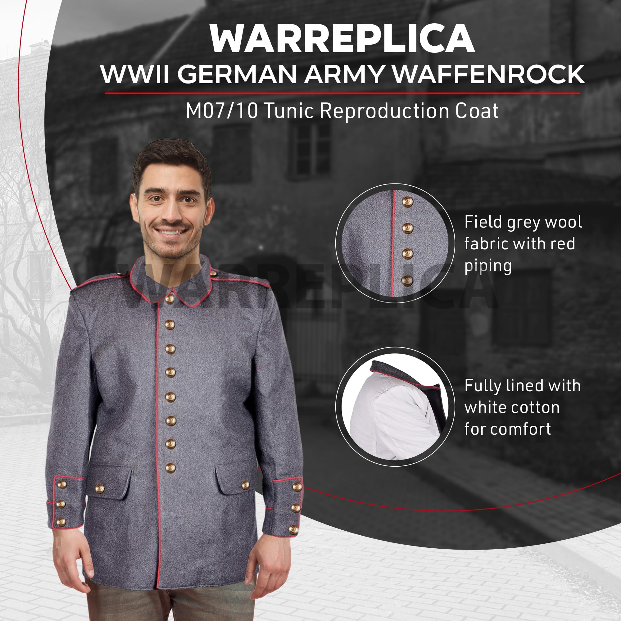 Description We are warreplica, and we have a worldwide reputation for producing the best items in their class. We understand that your money must be spent wisely on the clothing and equipment required for your historical activities. You don't want over-sized outfits that resemble clown suits or pyjamas that make you appear like a Sad-Sack. You need clothing and equipment that can survive heavy use, operate well, and make you look good while leaving a lasting impression. Skilled historical interpreters require high-quality materials that will not fail them in front of a public audience. And that’s why we are here. Product Specifications: - Brand Name – Warreplica Product - Warreplica WWII German Army Waffenrock M07/10 Tunic Reproduction Coat Size Available – 38 inches to 44 Sizes, We also do the custom size Colors Available – Field Grey