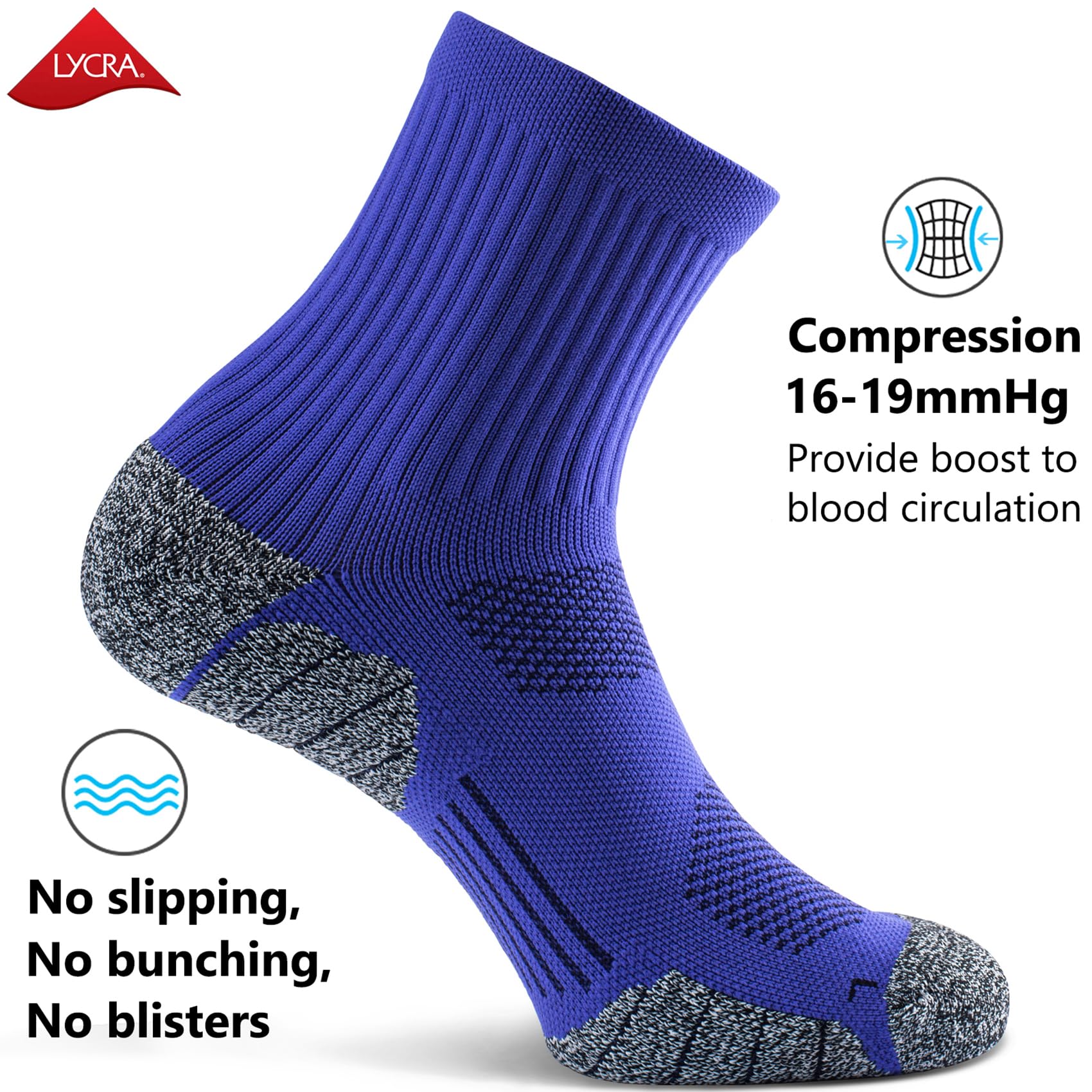 COMPRESSION FIT: Athletic socks with targeted compression (16-19 mmHg) to improve your circulation, anti-swelling, arch support, hug your feet perfectly and no slipping, no bunching, no blisters
