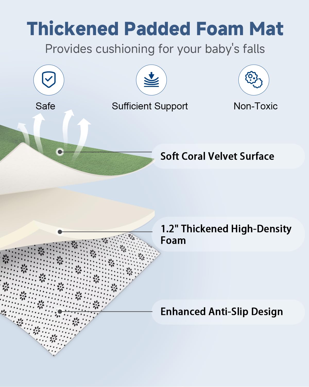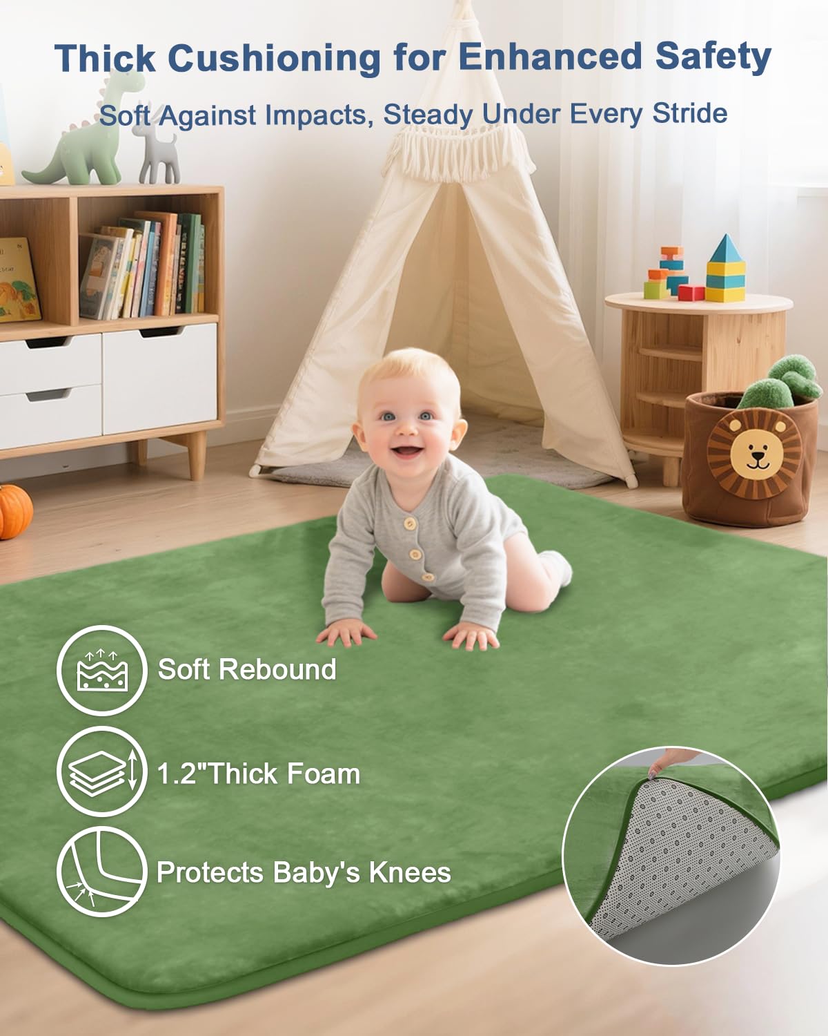 Thickened Foam Play Mat: Our padded foam mat is made of 1.2 inches thickened memory foam.It's sturdy enough to support two adults without ground feeling. The surface is made of ultra-soft flannel fabric, luxurious and comfortable for babies and family time.It does not fade.It provides a soft and safe play space, making it an ideal play mat for babies 6-12 months, encouraging them to explore endless fun with confidence.