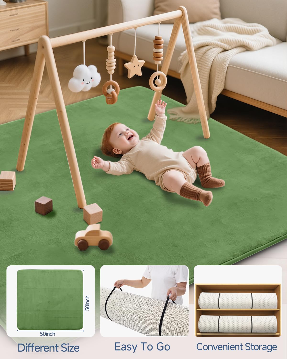 Multi-Purpose: The 50x50 size design, filled with 1.2 inches of high-density foam padding, is super soft and versatile. It comes with two elastic bands to help with storage or for carrying on the go. This mat can be used in children's tents, playrooms, bedrooms, living rooms, and even for outdoor play. Whether it's for crawling, playing, learning, or parent-child time, this mat provides ideal support and ample space for activities. Available in light gray, dark gray, and beige.
