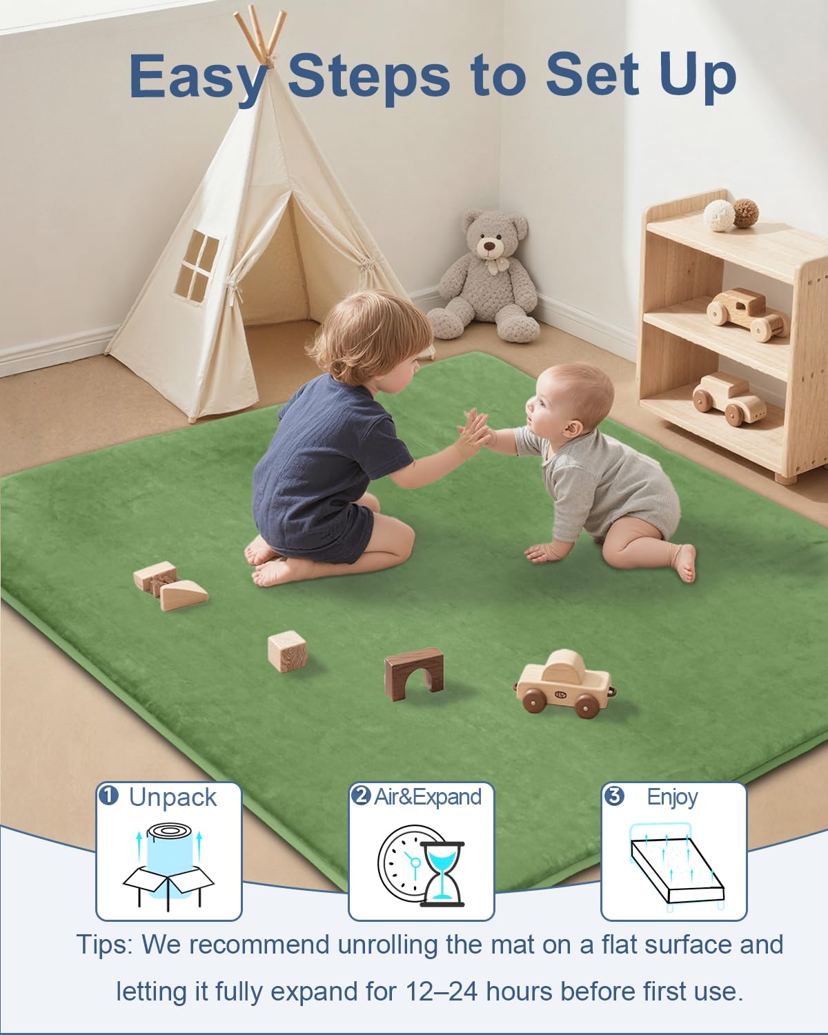 How to Care: Upon opening, the play mat will quickly expand. Place the mat on a flat surface and wait 12-24 hours to fully expand before use. For daily cleaning, gently pat the mat to remove surface dust and debris, or use a vacuum with a soft brush attachment to gently vacuum along the texture of the flannel. This helps keep your baby's play area smooth and clean. Avoid to direct sunlight to dry the mat, as this may prolong its lifespan.
