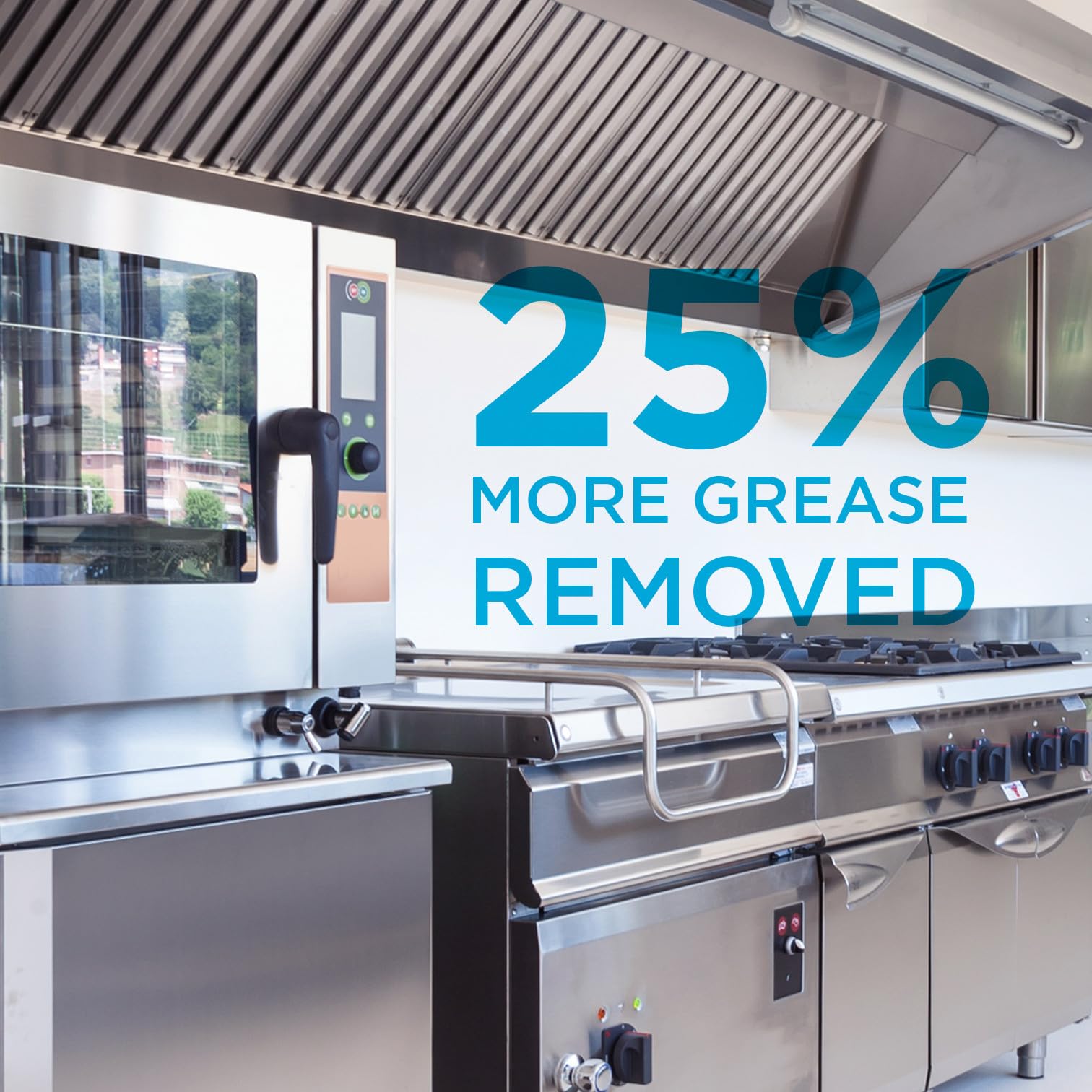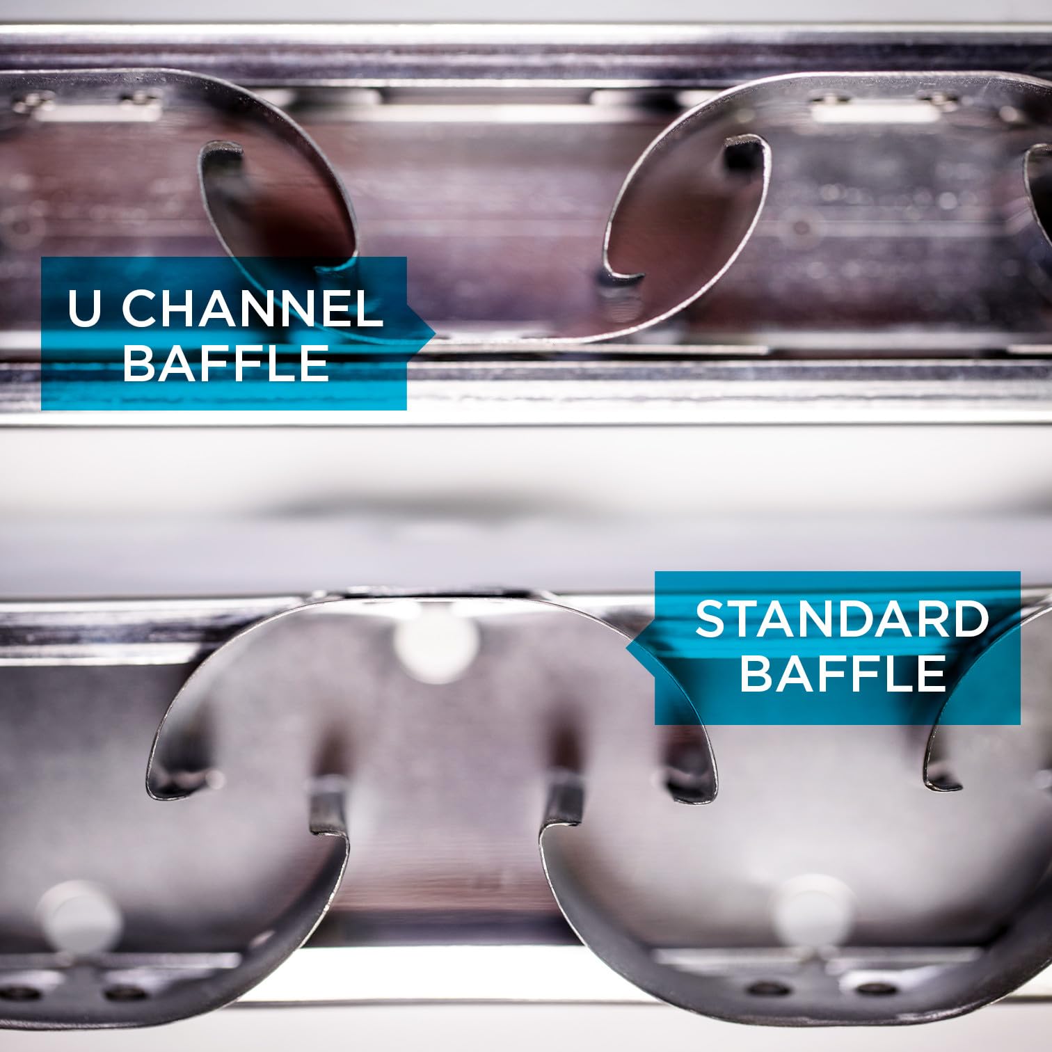 25% MORE GREASE REMOVED by U channel baffle design versus standard baffle grease filters