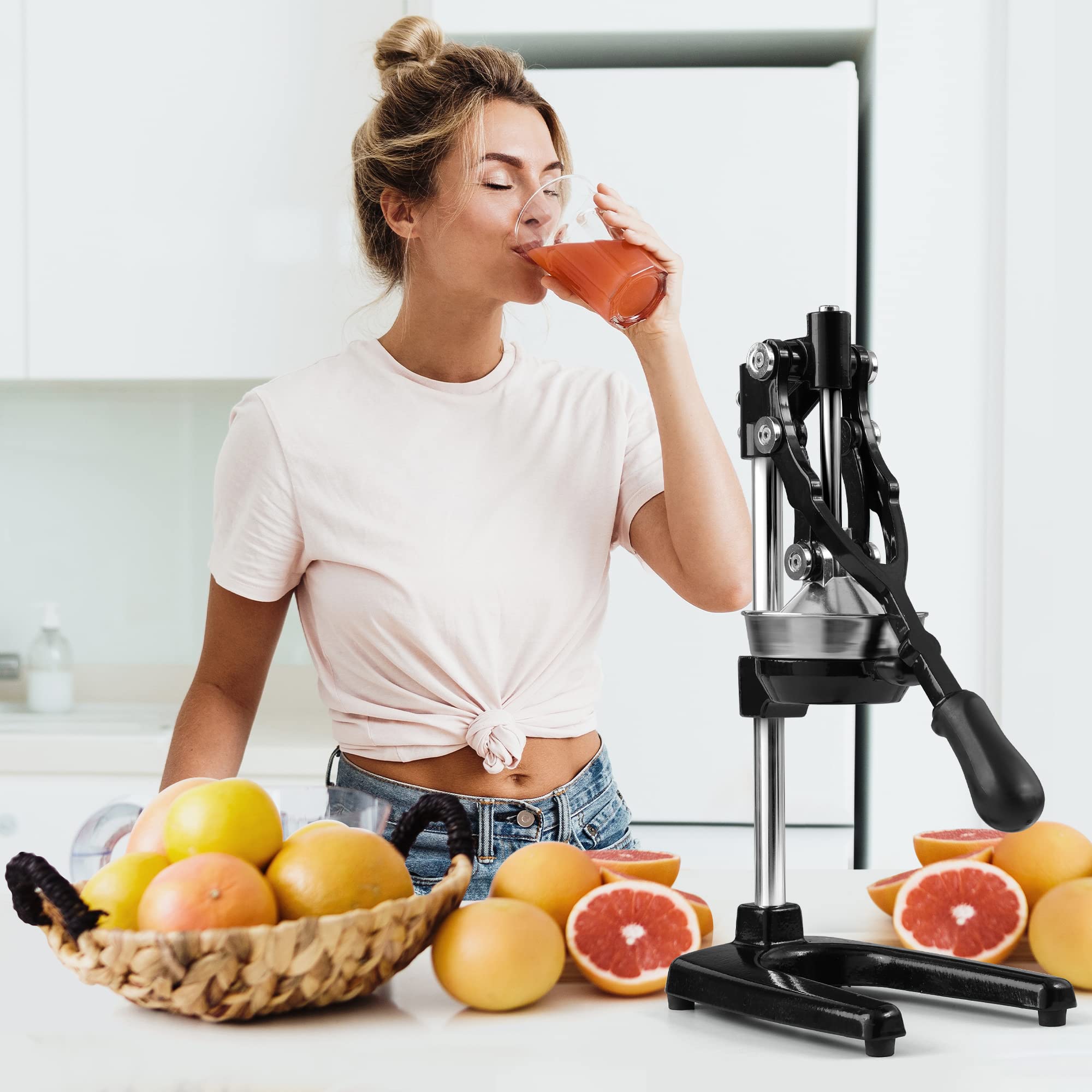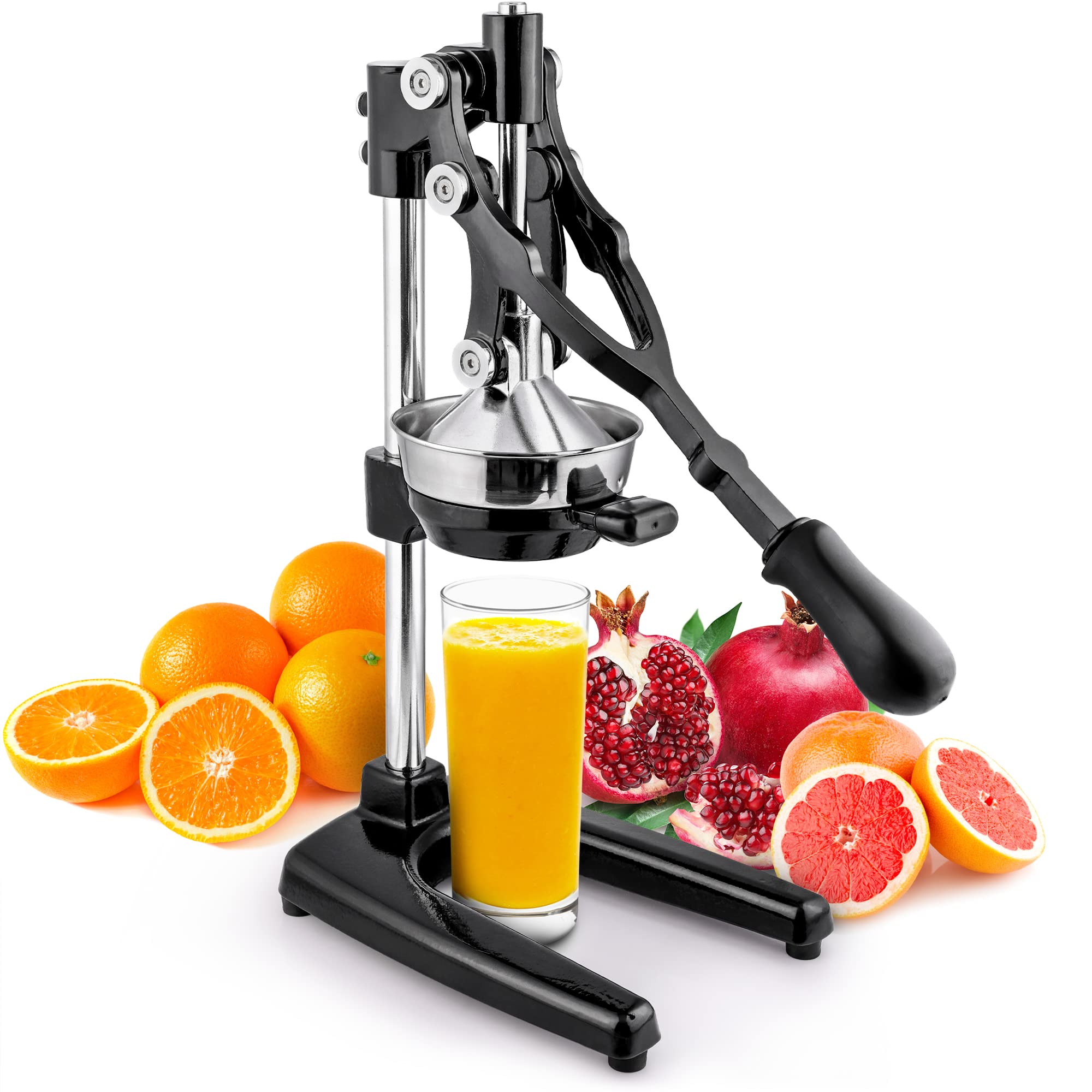 STURDY AND DURABLE DESIGN: This manual juicer is made of heavy-duty cast iron that is durable enough to last years of squeezing fresh juice. Our citrus press is designed with rubber feet to firmly keep it in place without the fear of falling, tipping, or sliding off the counter. This hand juicer is great for both professional and at-home use.