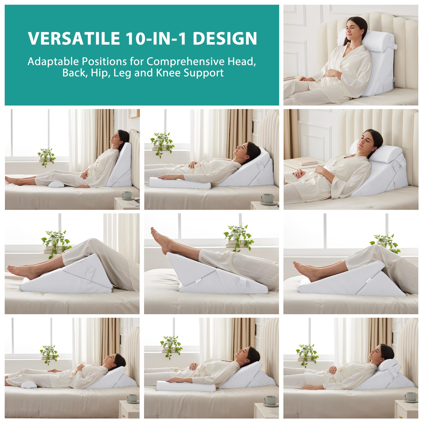 Adjustable 10-in-1 Design: Bedluxe's bed wedge pillow set offers a dynamic 10-in-1 adjustable design. Its ergonomic design supports various uses – from elevated back support for sleeping, reading or working, to a gentle slope for sleep, easing snoring, post-surgery discomfort, acid reflux, and improving blood circulation as a leg elevation pillow.