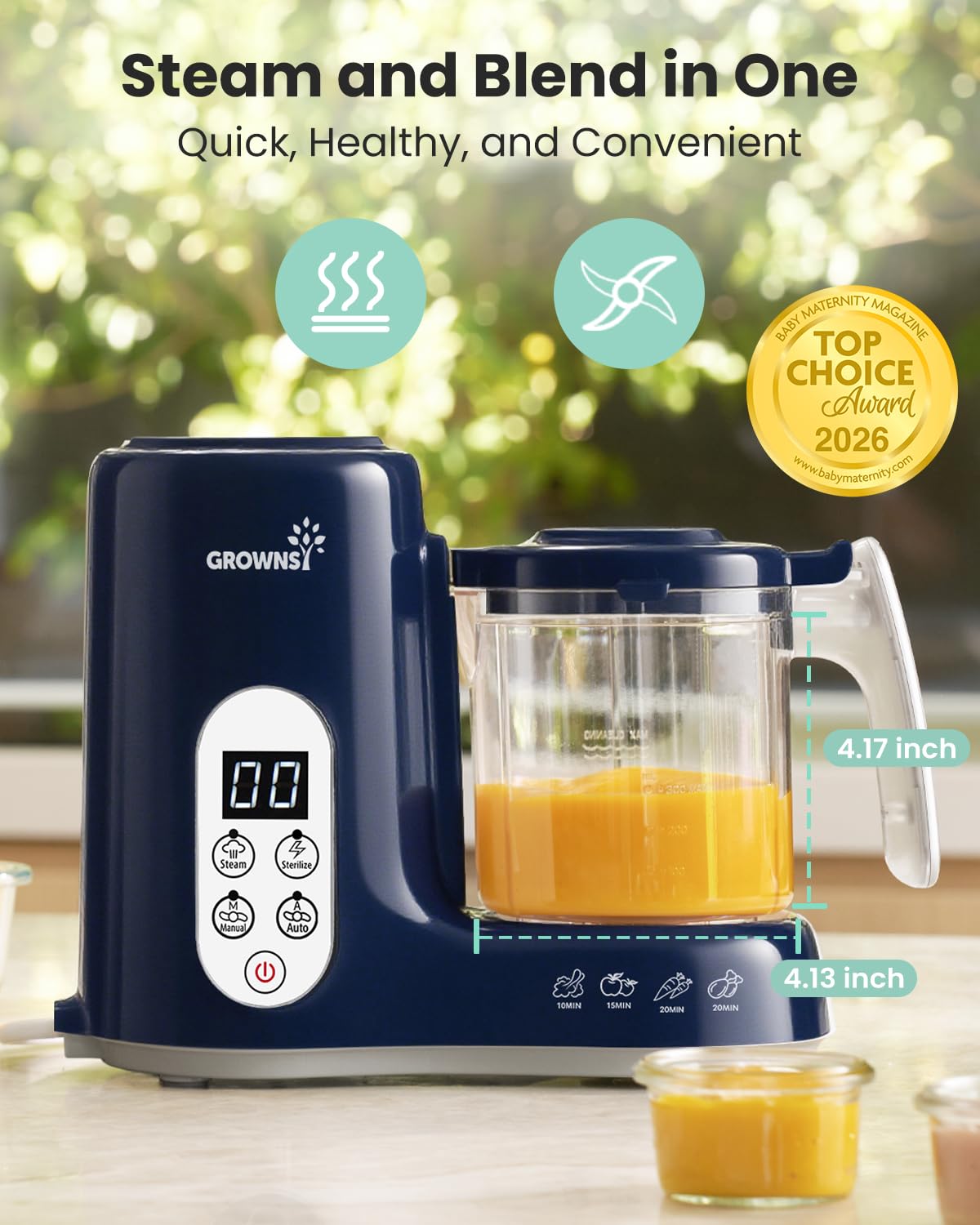 𝗦𝘁𝗲𝗮𝗺𝗶𝗻𝗴 𝗮𝗻𝗱 𝗕𝗹𝗲𝗻𝗱𝗶𝗻𝗴 𝗶𝗻 𝗢𝗻𝗲: This baby food maker seamlessly combines steaming and blending in a single device, simplifying meal prep and eliminating the need for extra kitchen tools. The built-in sterilizer mode saves time and effort, giving you more precious moments with your baby.