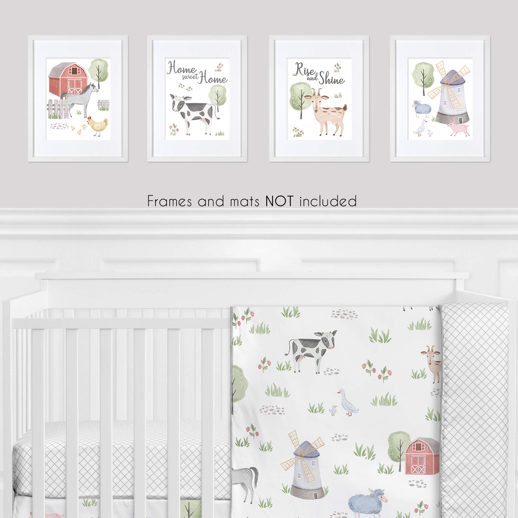 Decorative wall art print set features watercolor farm animals, a barn, and a silo with inspirational "Home Sweet Home" and "Rise and Shine" quotes.