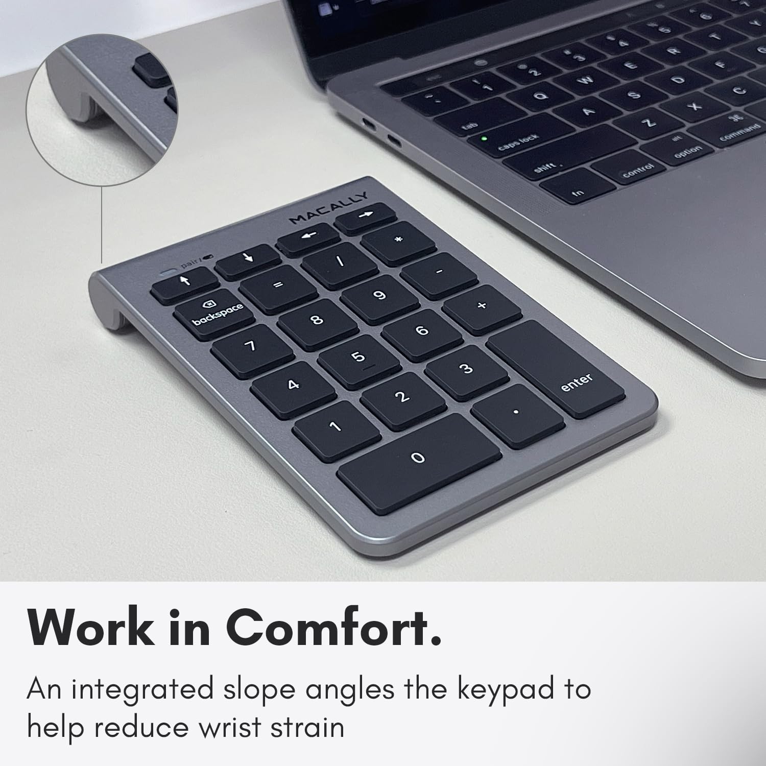 COMFORTABLE ERGONOMIC DESIGN: Designed to fit the average hand and to prevent wrist strain with a tilted slope; the wireless 10 key numpad is the perfect gift for bookkeepers working on excel, teachers entering grades, office workers for data entry, etc.