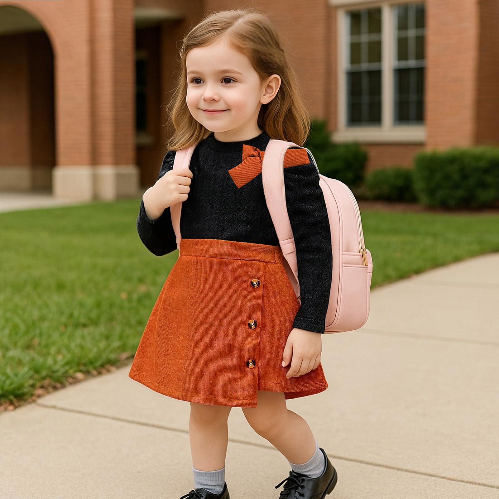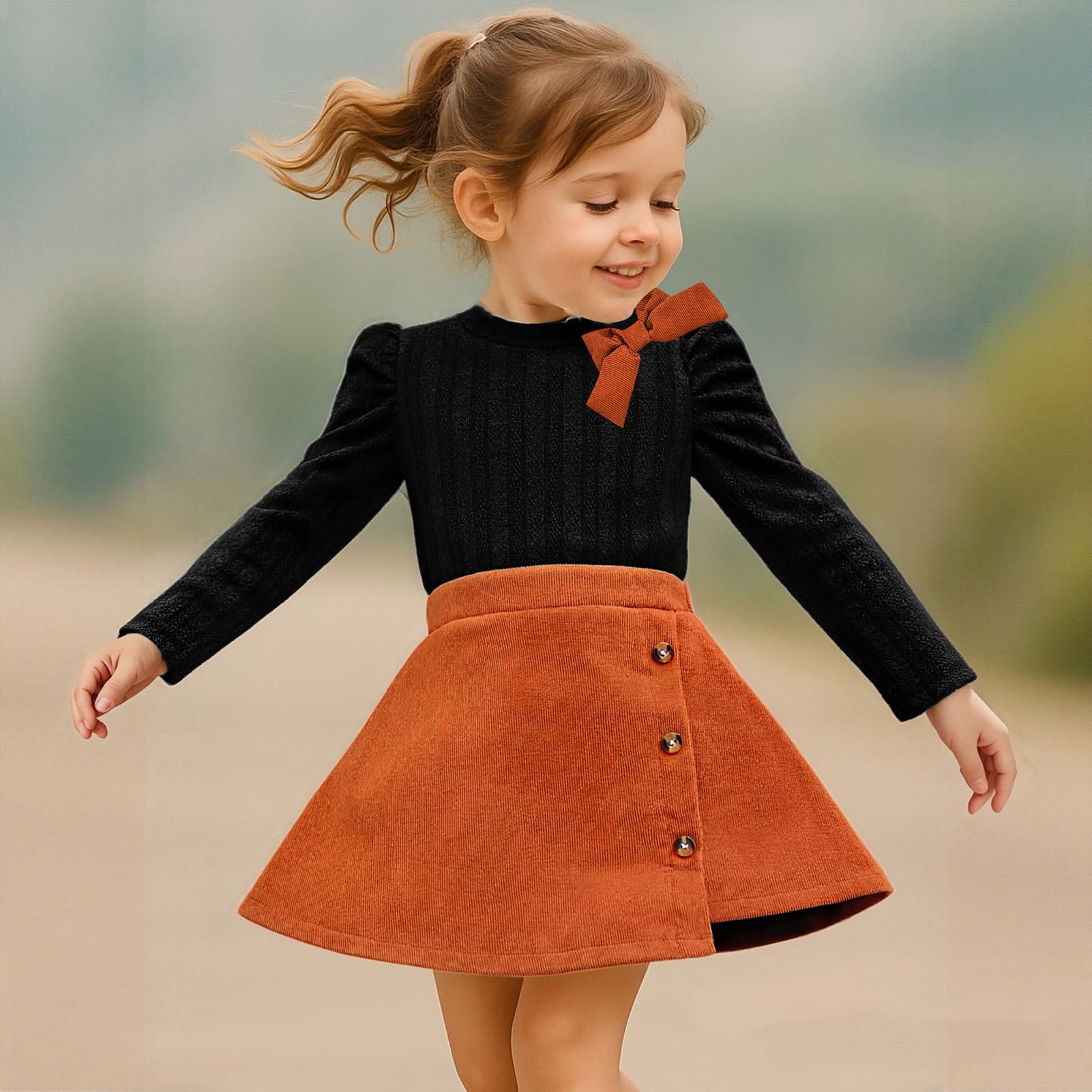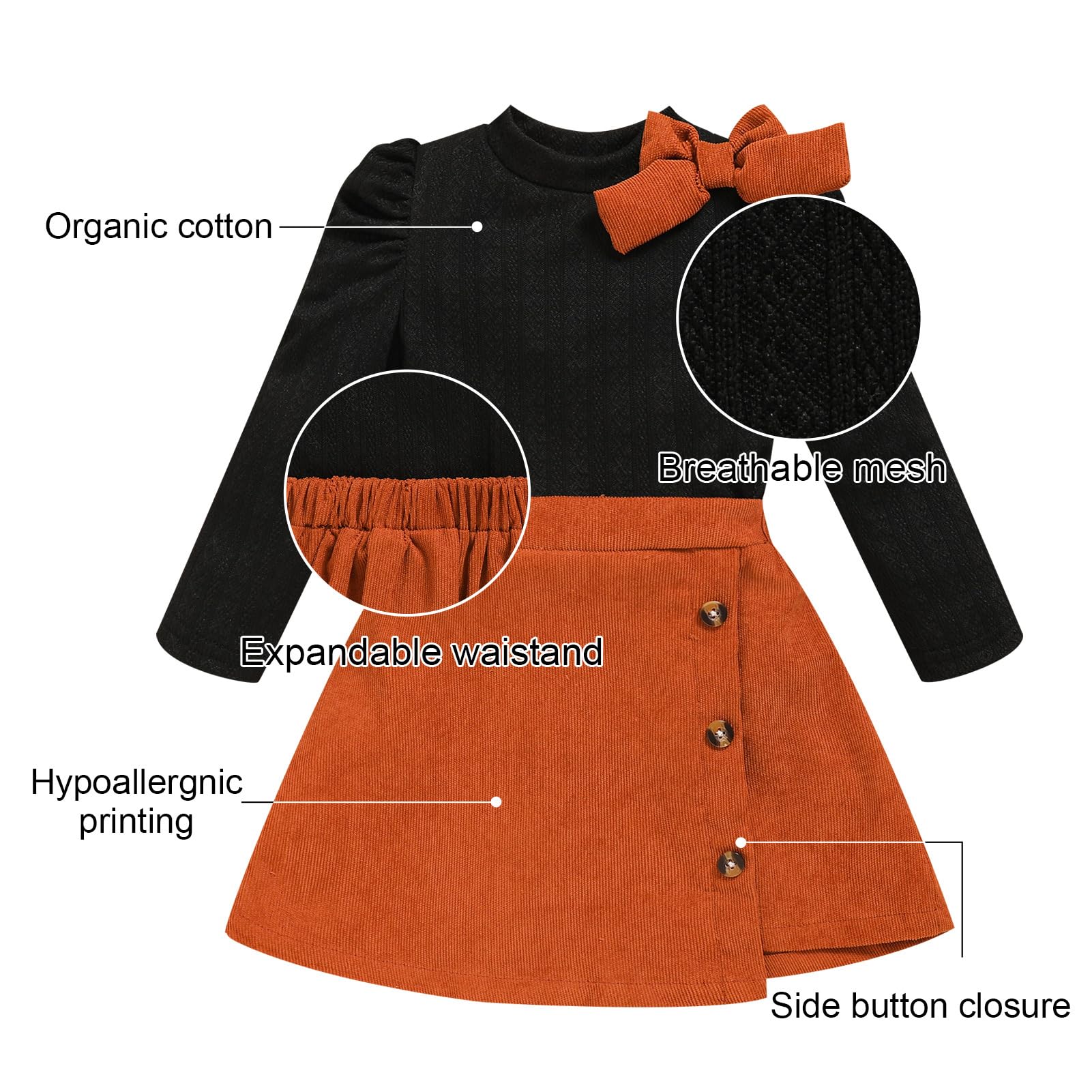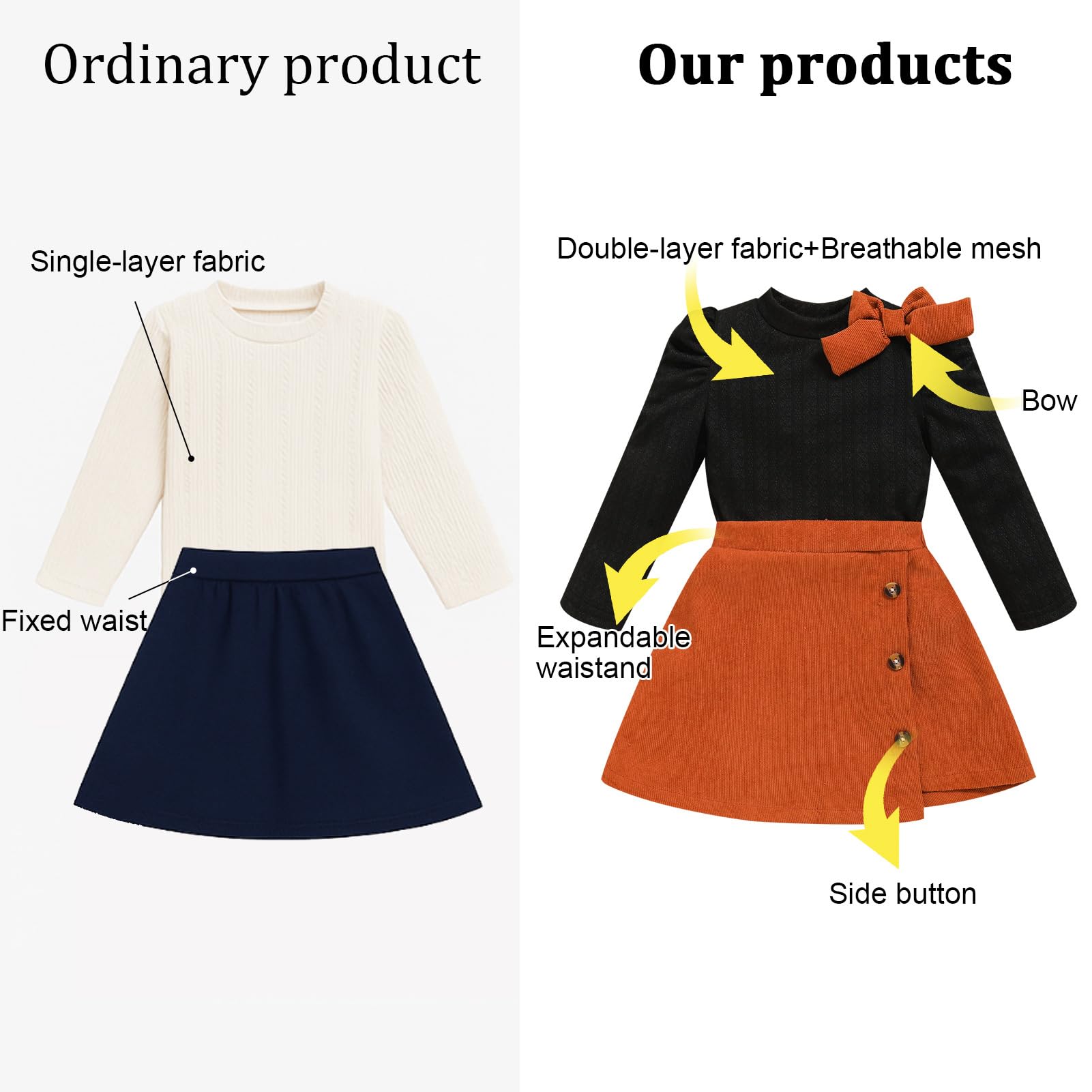 MATERIAL: Toddler girl shirt sweater top is made of cotton and polyester, bottom skirt is made of cotton blend and polyester, soft, breathble, and comfortable, sweet toddler baby girl 2 piece skirt set, cute baby girl clothes.