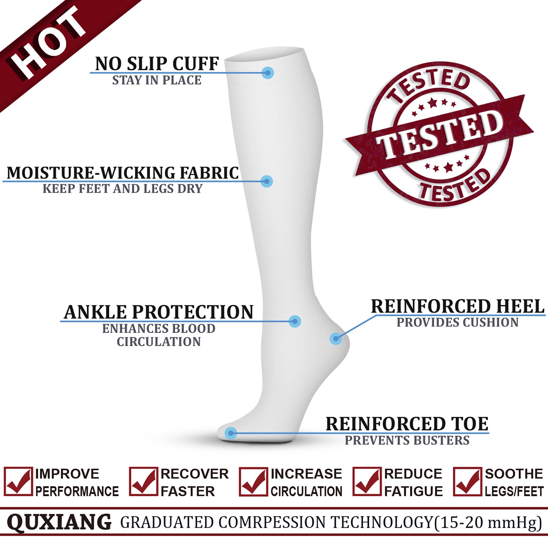 COMPRESSION BENEFITS - QUXIANG Compression socks are designed to promote blood circulation and oxygen flow preventing fatigue and helps in muscle recovery. Whether you are an athlete, sportsperson, teacher, flight crew, receptionist, office worker, pregnant, recovering patient, nurturing mother, elderly, our socks are universally suitable for all work.