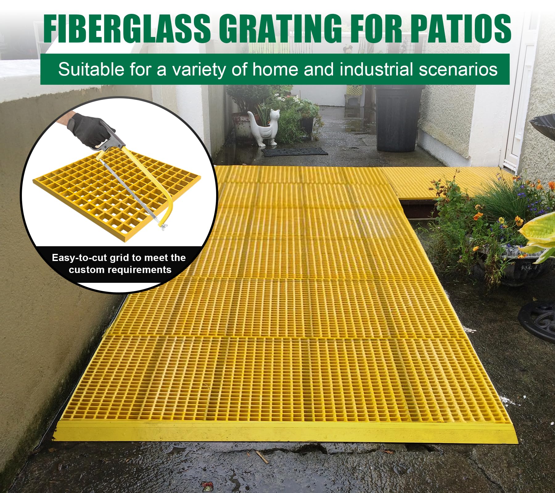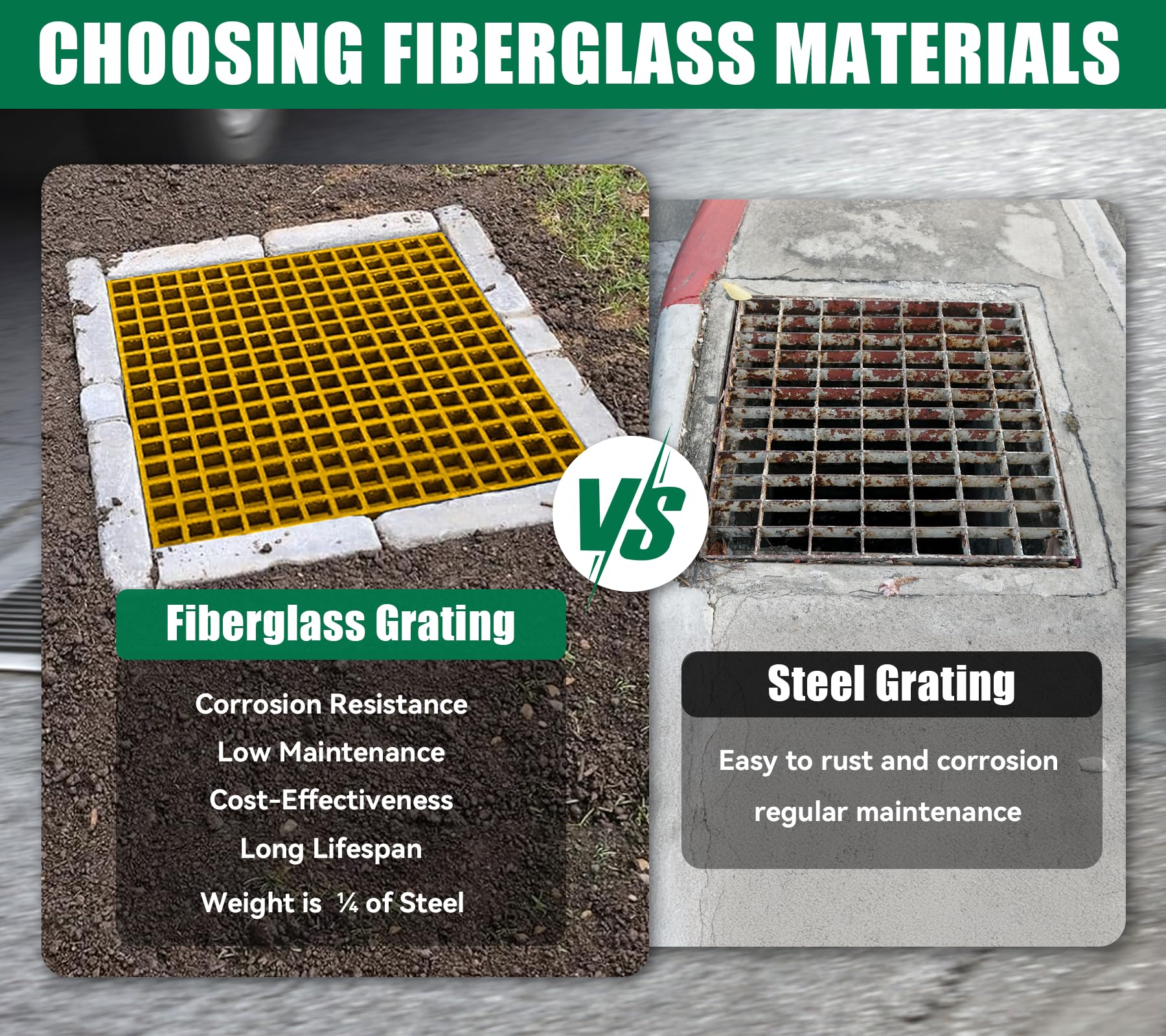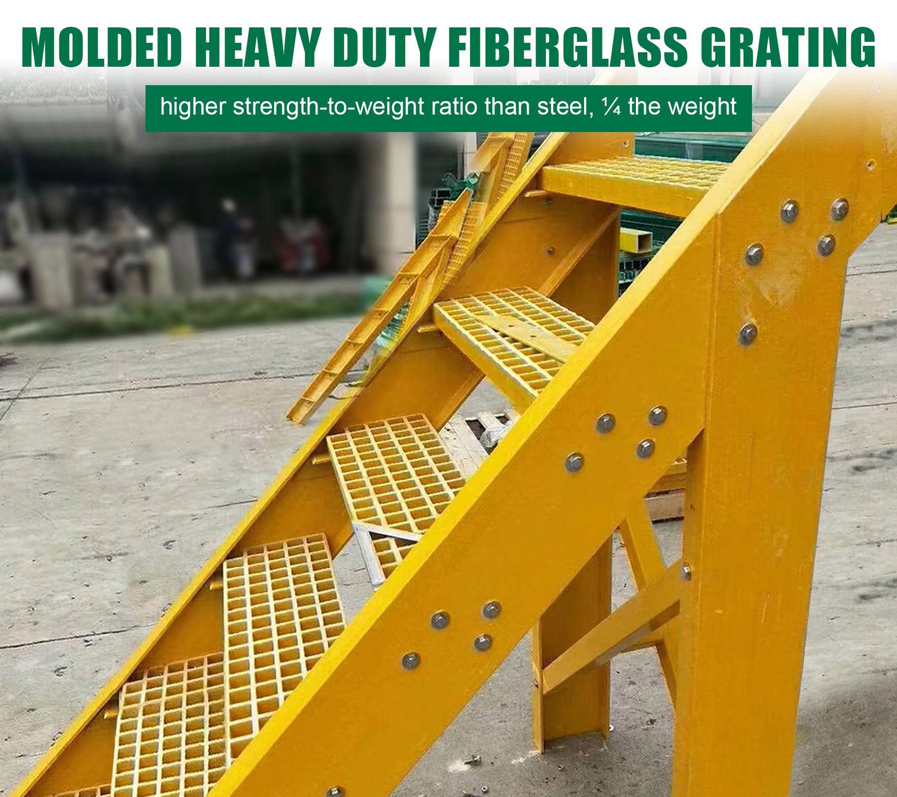 【Easy to Cutting and Install】Molded fiberglass grating can be cut into any shape or size to fit the trenches outside the facilities or stairs. Use Fasteners for Fiberglass Bar Grating to secure.