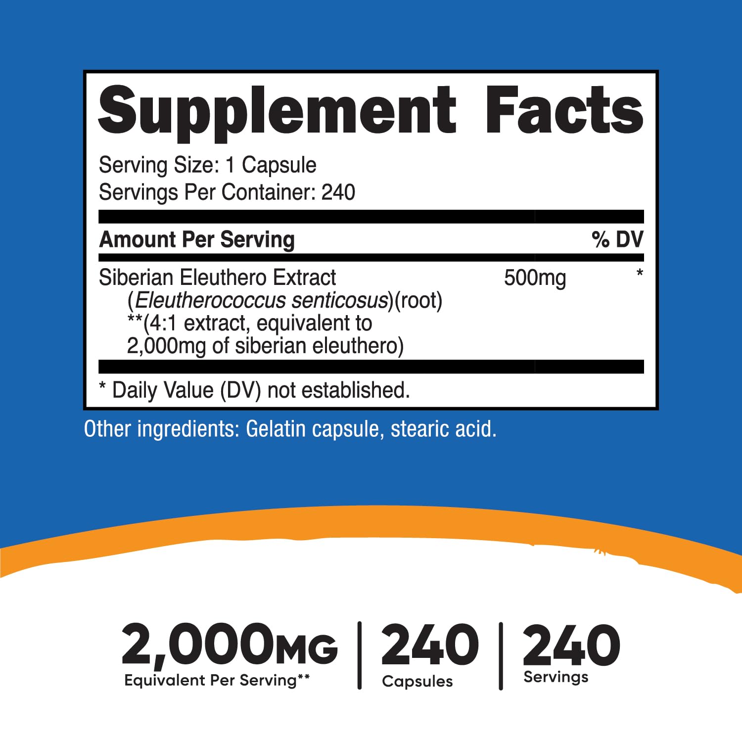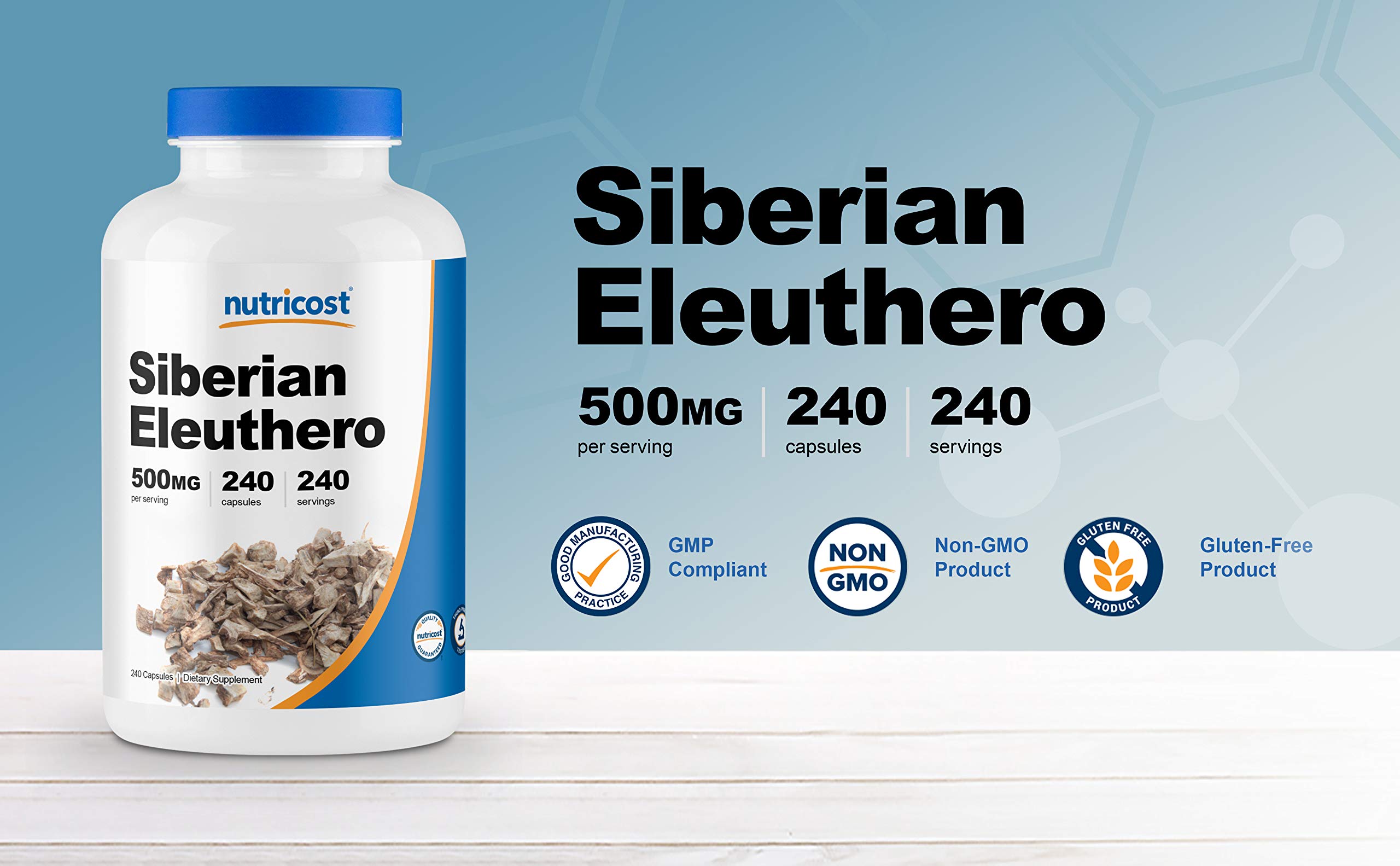 Nutricost's Eleuthero capsules contain 500mg of high quality Eleuthero and 240 capsules in each bottle. Eleuthero (Eleutherococcus Senticosus) was often referred to as Siberian ginseng. However, a recent Name Change law was passed regarding the use of the name "ginseng." This legislation requires that any ginseng product must be of the panax genus, or it cannot be called ginseng. All Nutricost products falling under this have been renamed to comply with this legislation. Eleuthero is a powerful adaptogenic herb that has been shown in many studies to help protect the body against the effects of physical and mental stress.* It has been a staple in eastern medicine for over 2,000 years, enjoying a history of both safety and effectiveness. The eleuthero roots used in Nutricost Siberian Eleuthero are carefully selected based on their high eleutheroside concentration and then tested by independent (3rd party) ISO-Accredited laboratories for both quality and safety.