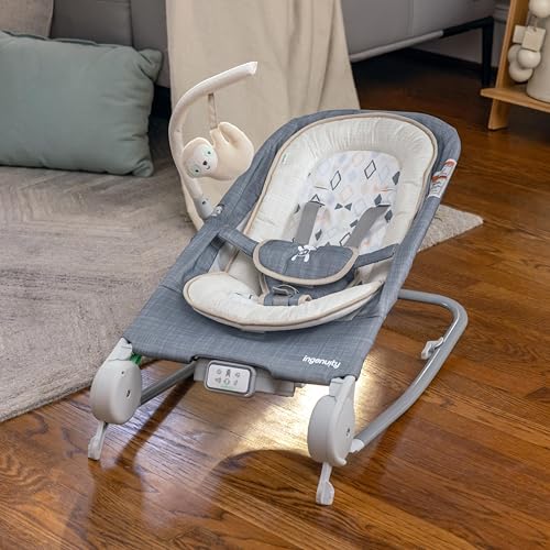 A happy belly = a happy baby! The first-ever, patent-pending Ingenuity Happy Belly Rock-to-Bounce Massage Seat - Parker has integrated belly massage technology offering a circular massage motion to help soothe baby and help provide relief from discomfort. Designed in the USA with expert-led advice, this seatβs belly massage rollers resemble a gentle fingertip massage and are safely activated by a parent's push of a button and turn off automatically after 3 minutes of massage. A GentleTouch control pad operates 20 melodies, nature sounds, vibrations and massage to easily keep baby entertained; 3C batteries required. This seat from the #1 Manufacturer of Bouncers* converts from a bouncer to rocking seat and offers a plush infant insert and 5-point harness to keep baby comfy and safe. Folds flat for easy storage. Includes easy-carry travel bag. Detachable toy bar with a soft, plush Loni the Sloth character toy. For ages 0-6 months or up to 20 pounds, whichever comes first. Assembled dimensions are 27.4'' x 16'' x 22''. Third party safety tested and approved. (*Circana, Retail Tracking Service, U.S., Bouncers, dollar sales, 12 months ending October 2023)