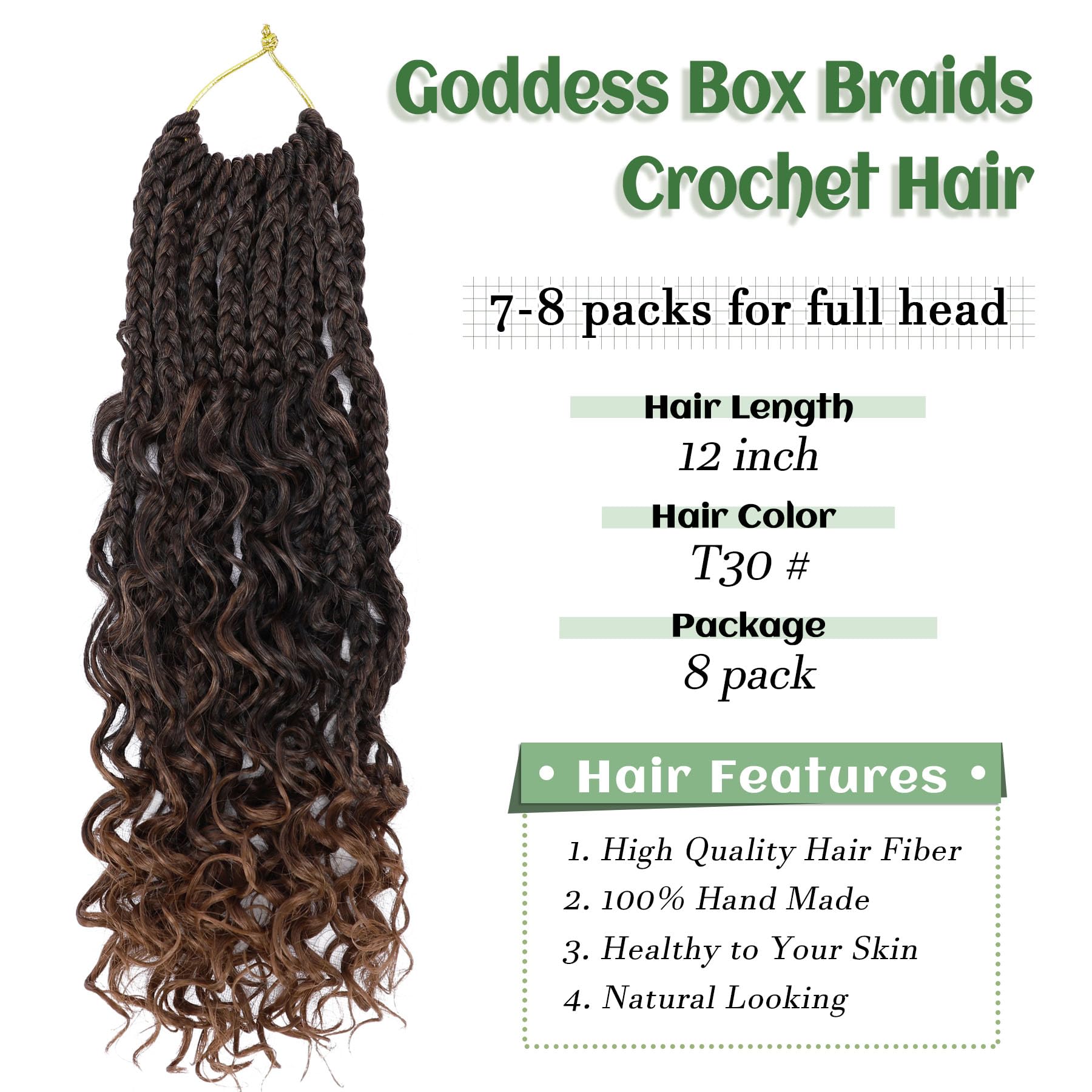 Hair Length and Package: goddess box braids crochet hair is 10 inch, 12 inch and 14 inch, 16 strands one pack, 8-9 packs are enough to make a full head. Hair Color:1B, #2 , #27 , #30 , 1B /27 color, 1B/30, T30/27,T30/613,Tgray color and 1B/Burgundy color. More colors are available.