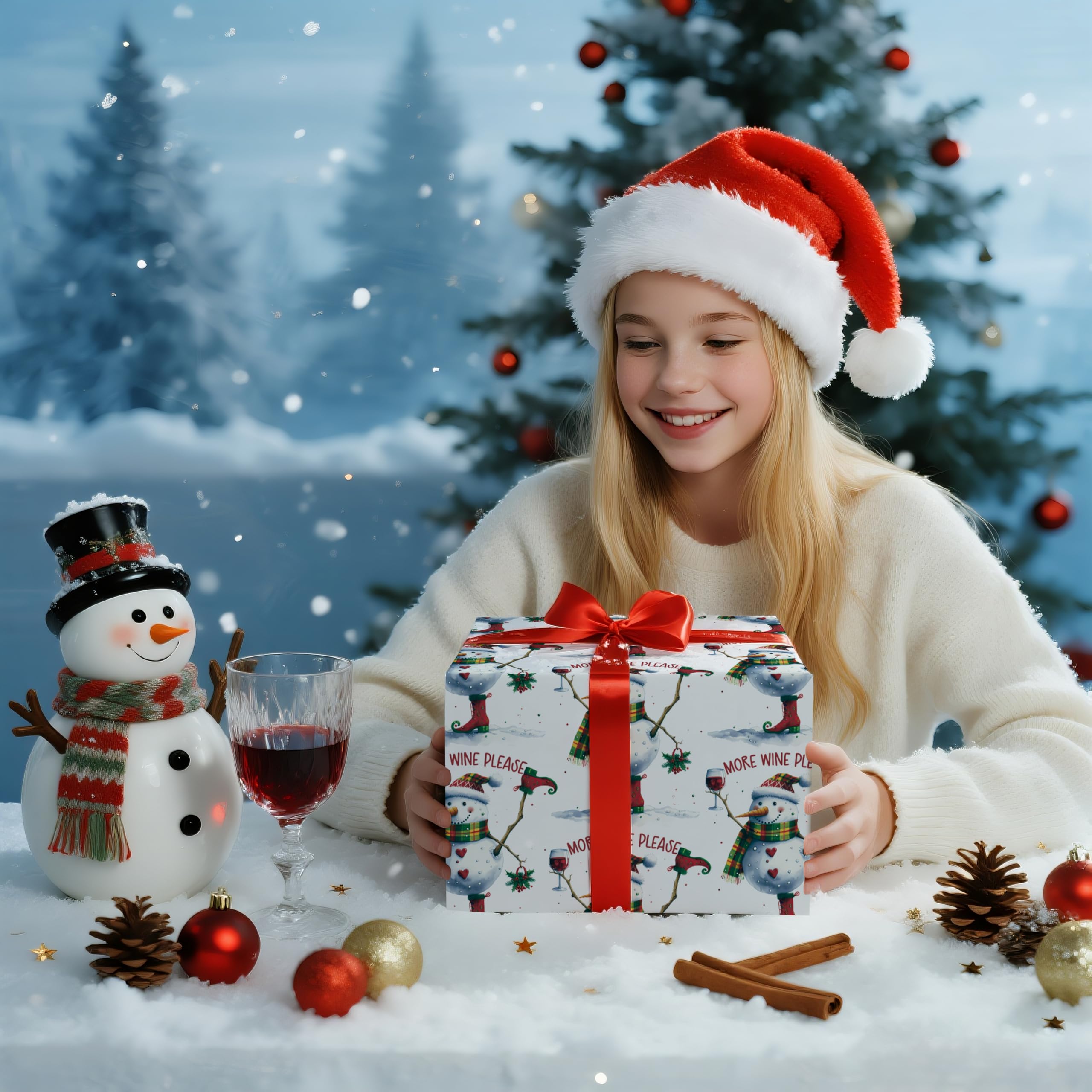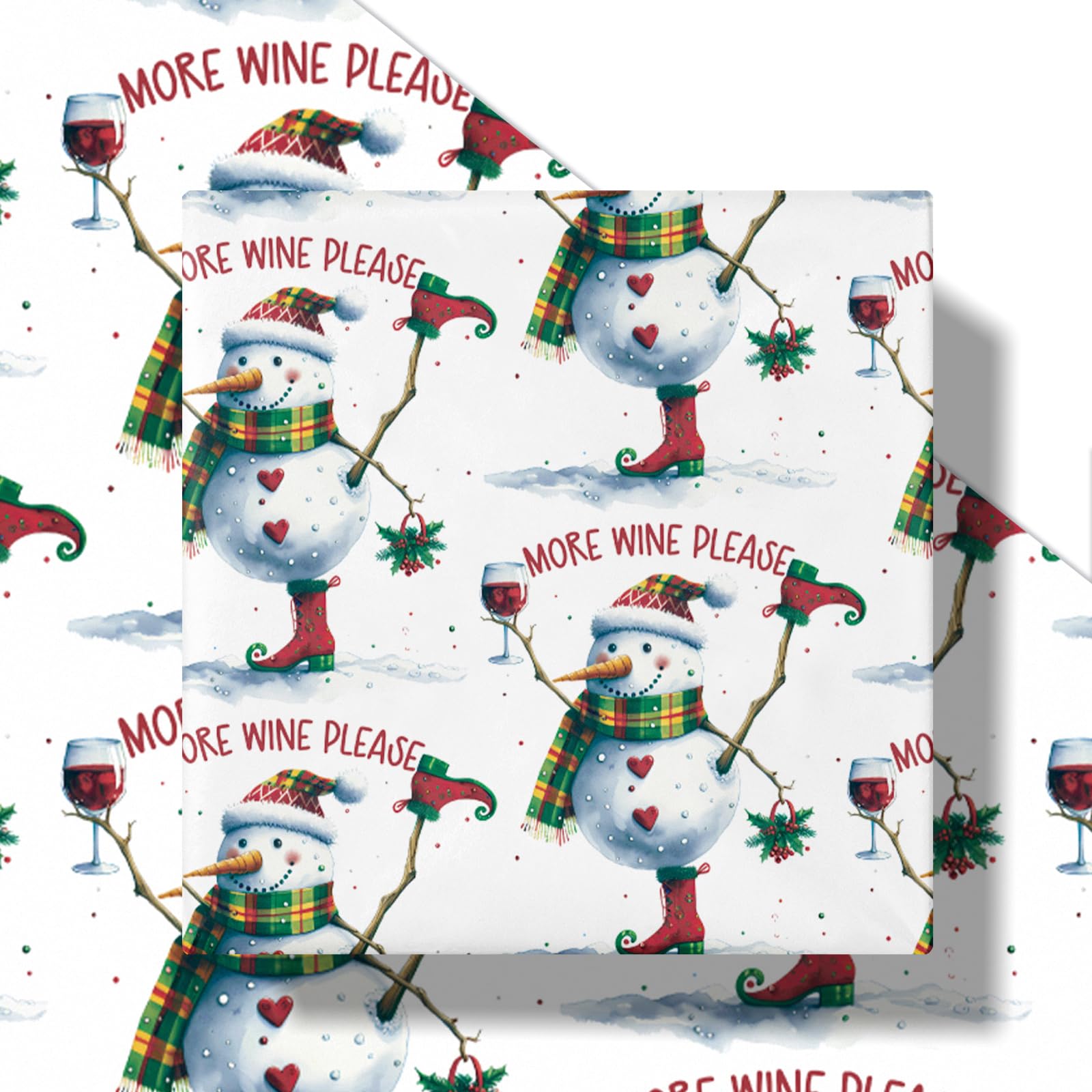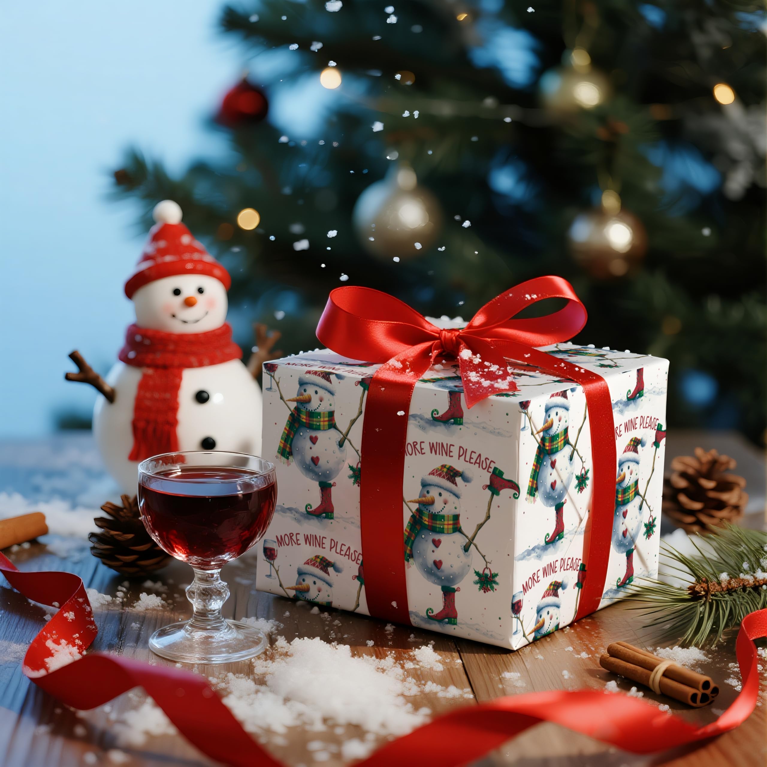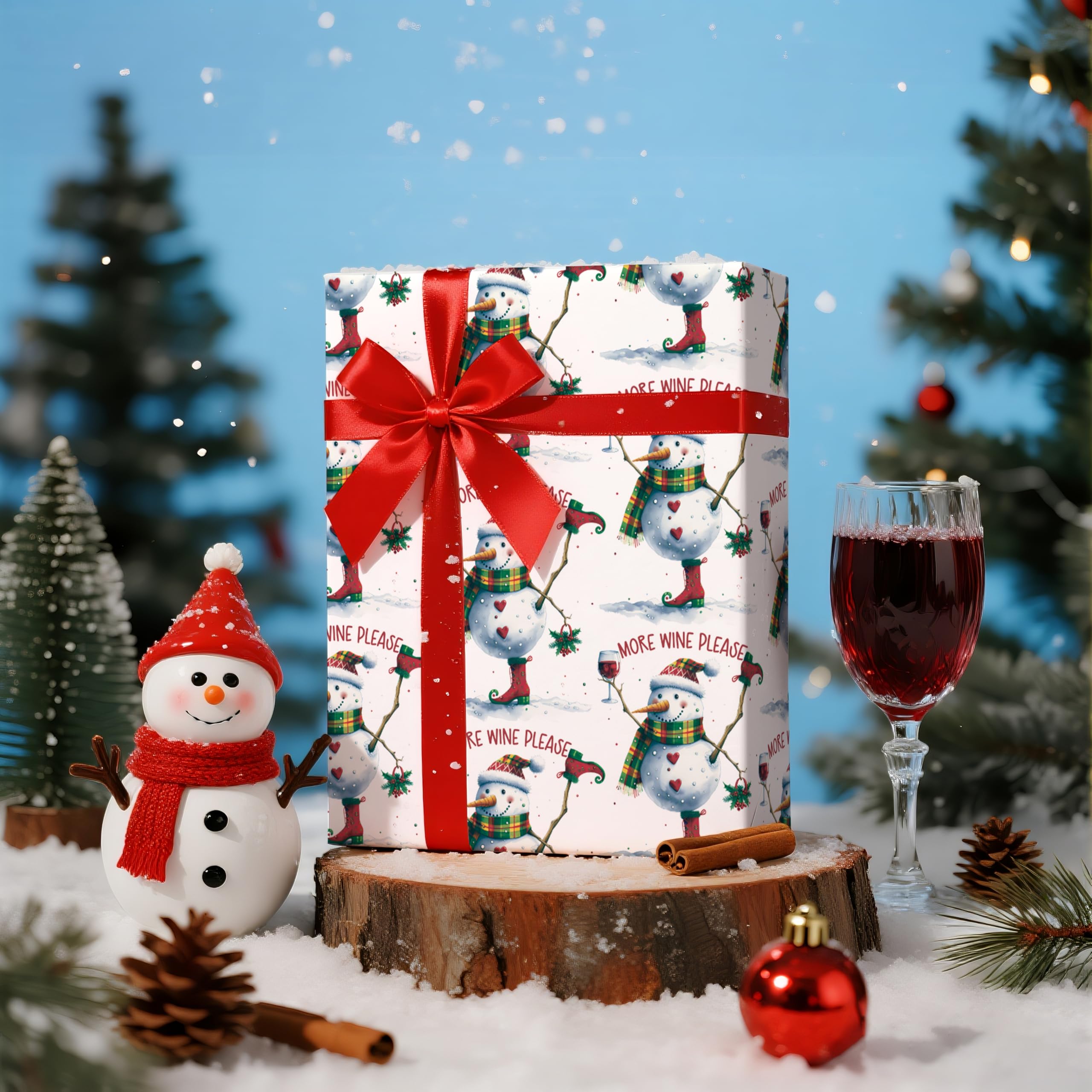 Wrap up the laughs this season with LeZakaa's Funny Wine Snowman Wrapping Paper Roll. This 17" x 16.4' mini roll features a cheerful snowman in elf boots, plaid scarf, and festive hat holding a glass of red wine and a sprig of mistletoe, captioned with the bold phrase "More Wine Please." It's the perfect choice for wine lovers and anyone who enjoys adding a bit of humor to holiday gift-giving. Great for wrapping wine bottles, holiday baskets, or party favors—this design is sure to get a giggle under the tree.