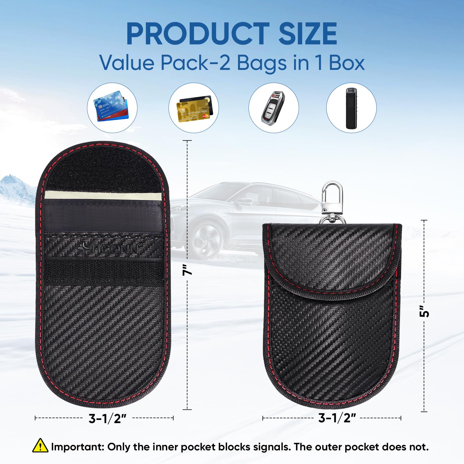 Why You May Need One: Get your car protected; TICONN faraday bag provides a complete signal blocker for your vehicle key fob; This prevents thieves from picking up and relaying signals from your key, to shield against break-ins and keyless ignition theft