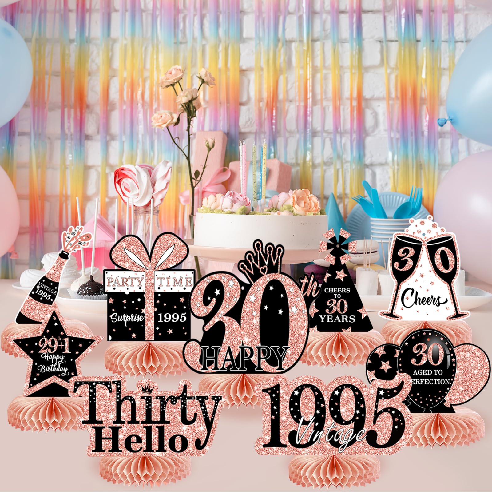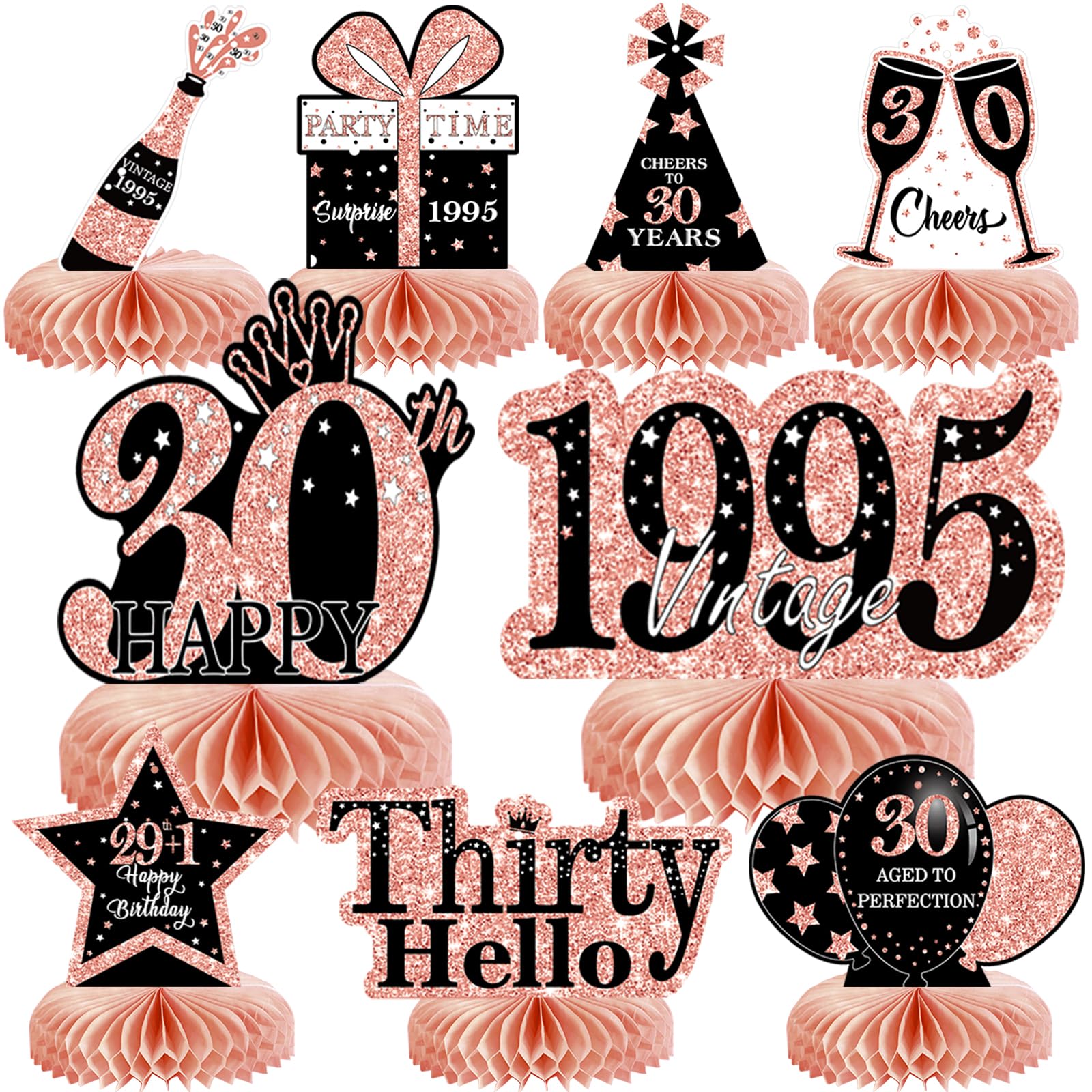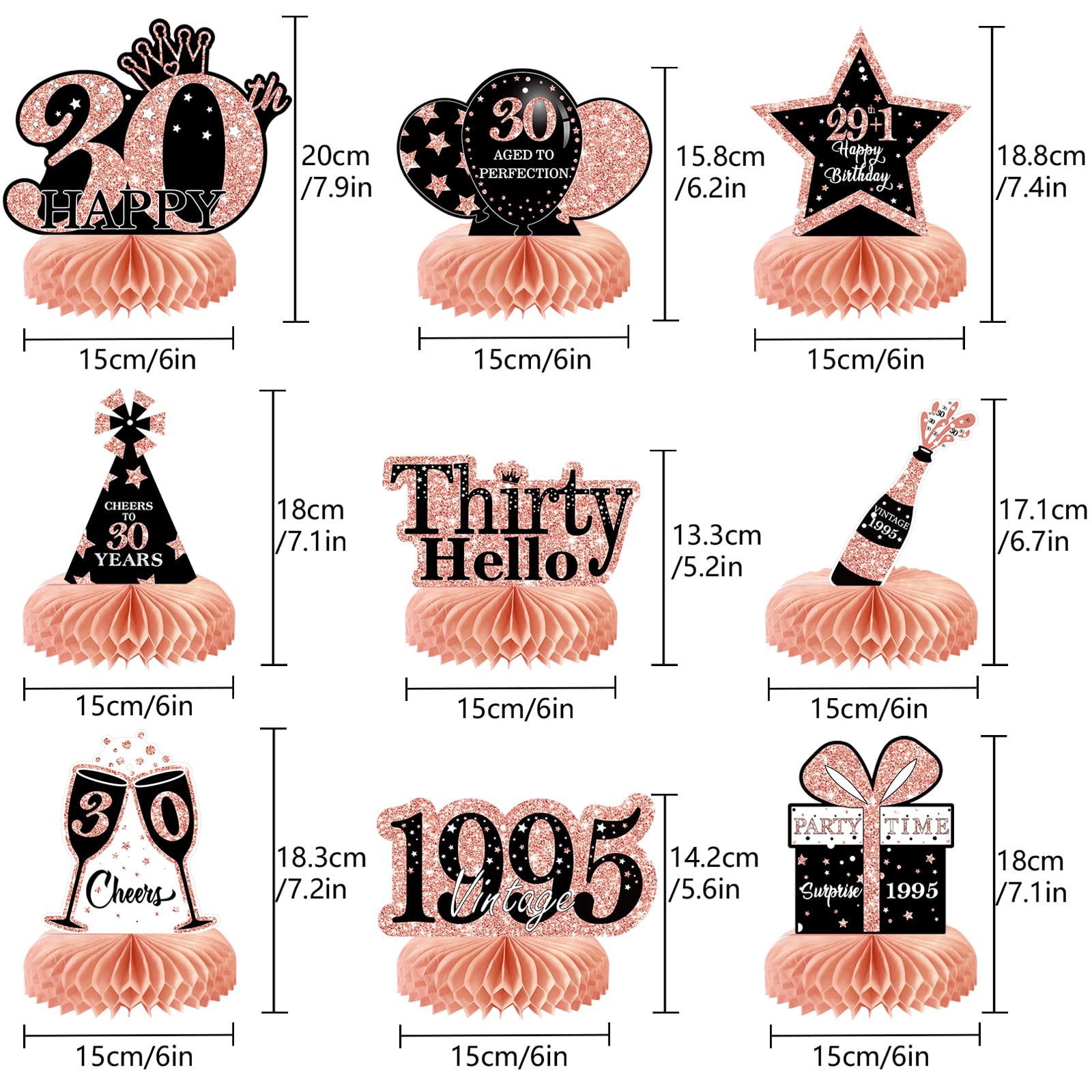 [You will get] - 9 pcs rose gold 30th birthday decorations honeycomb table centerpieces for women, it contains 9 patterned cardboards and 9 paper honeycombs,and matching lanyards.These chic 30th birthday table decorations are enough to decorate your themed party.