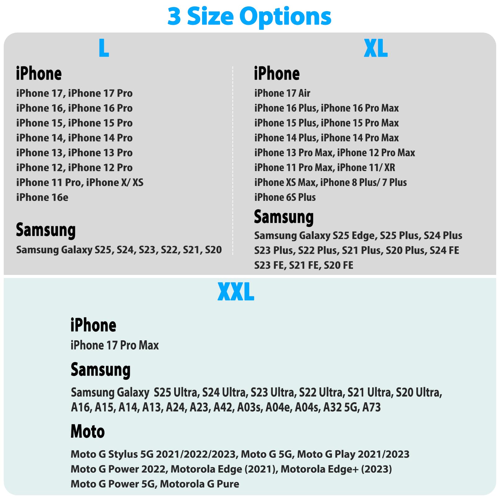 Choose from three sizes: L - 6.29x3.05 x0.59 inches, XL - 6.69x3.14x0.59 inches and XXL - 6.88x3.34x0.59 inches for a perfect fit with your phone