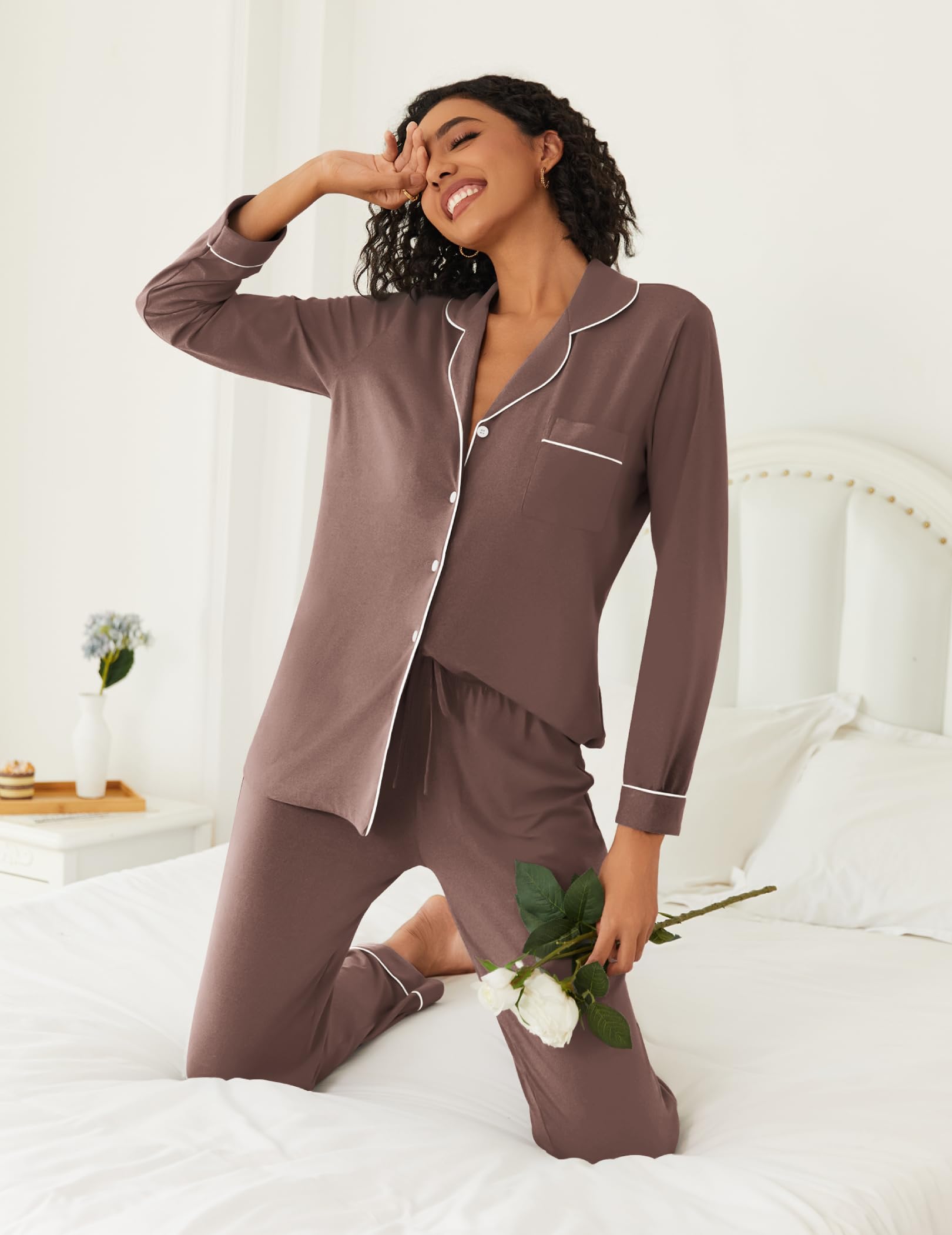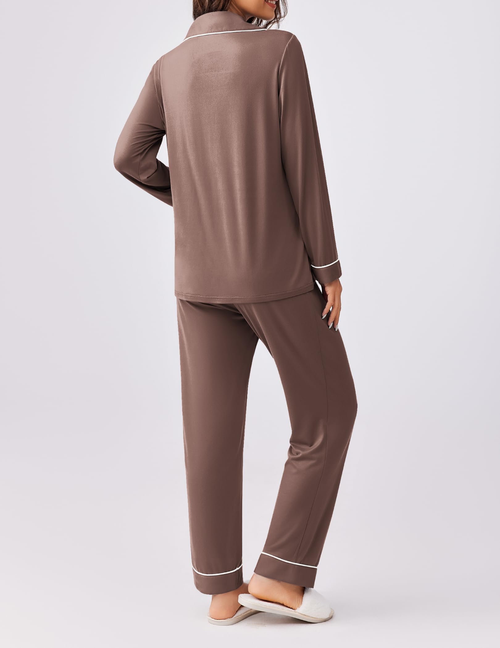 【Features】Long sleeve pajama tops feature chest pocket, notch collar and contrast piping trim. The button design is easy to put on and take off, and can also be used for postpartum breastfeeding. Pants with soft drawstring elastic waist fits for any body size. Please note that the pants do not have side pockets