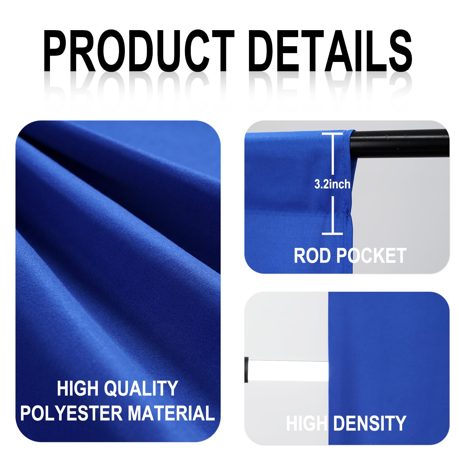 It can be used on both sides, washable, ironable, foldable, durable, light weight, and good vertical feeling, easy to store and carry. And it has a 3.2inch rod pocket in the top to hang backdrop.