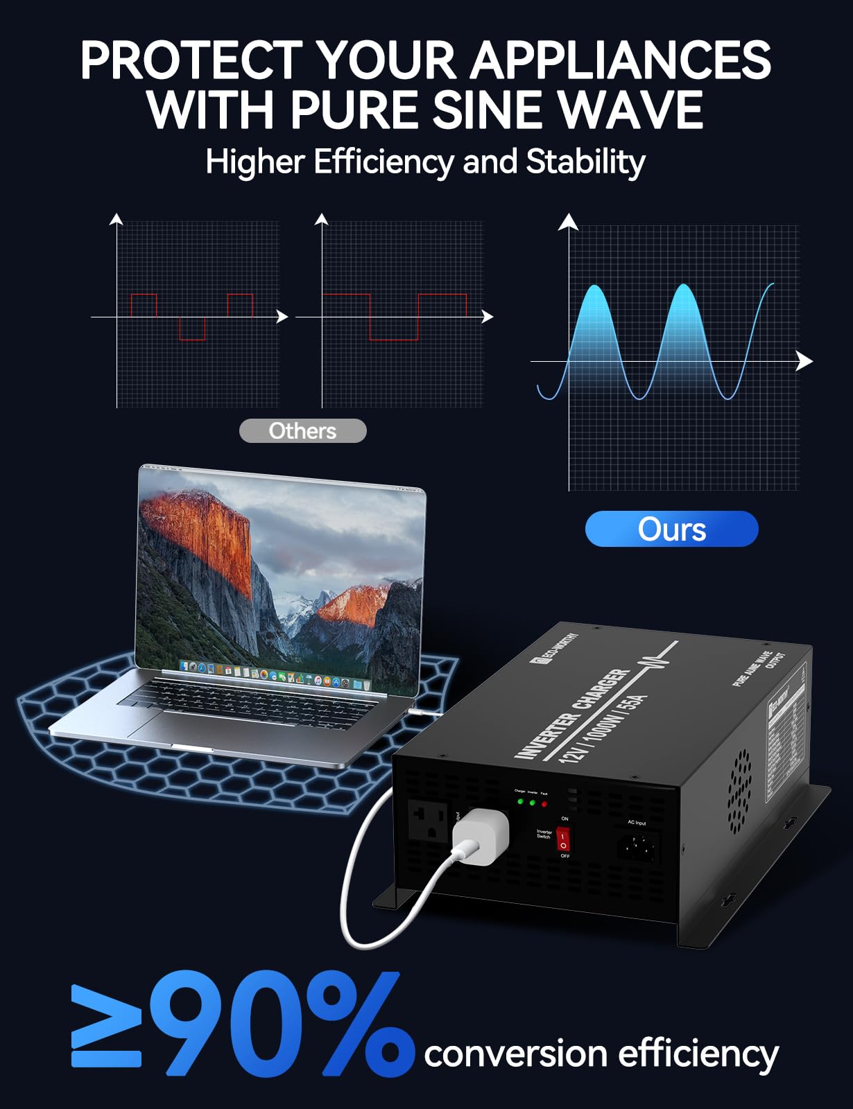 Uninterrupted Power Supply (UPS): This inverter charger features an automatic switch to battery power within 20ms during grid failures, ensuring a reliable and uninterrupted power supply to your device while protecting it from damage