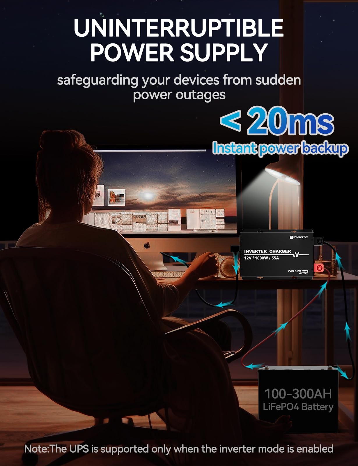 1000W Inverter & 55A Charger 2-in-1: ECO-WORTHY inverter charger combines both an inverter and battery charger in one unit, delivering a powerful 55A charging capability for 12V LiFePO4 batteries and 1000W output (peak power 2000W) to efficiently power appliances such as microwaves and refrigerators