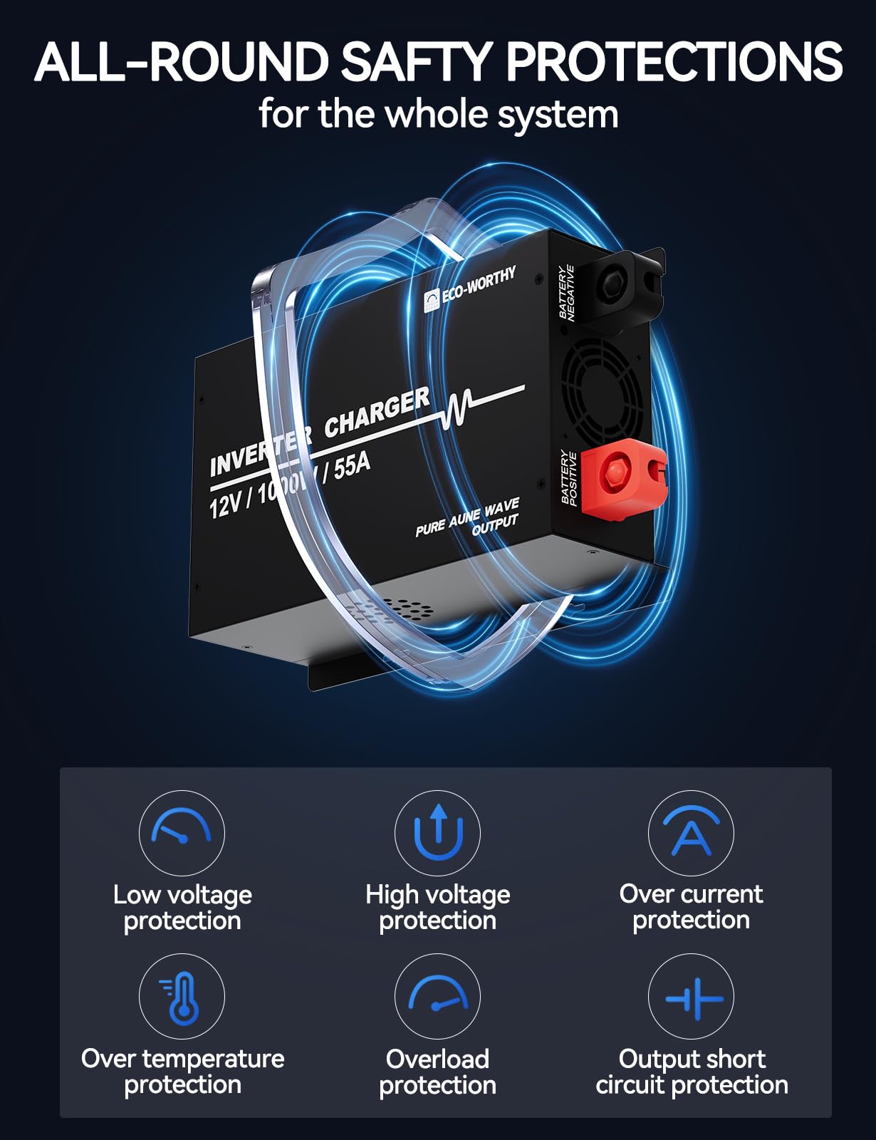 Full System Protection: Utilizing pure sine wave technology, the inverter charger provides stable and efficient output while protecting your electronic devices. It includes multiple protections such as high/low voltage, overload, overcurrent, overtemperature, and output short circuit, making it safer to use