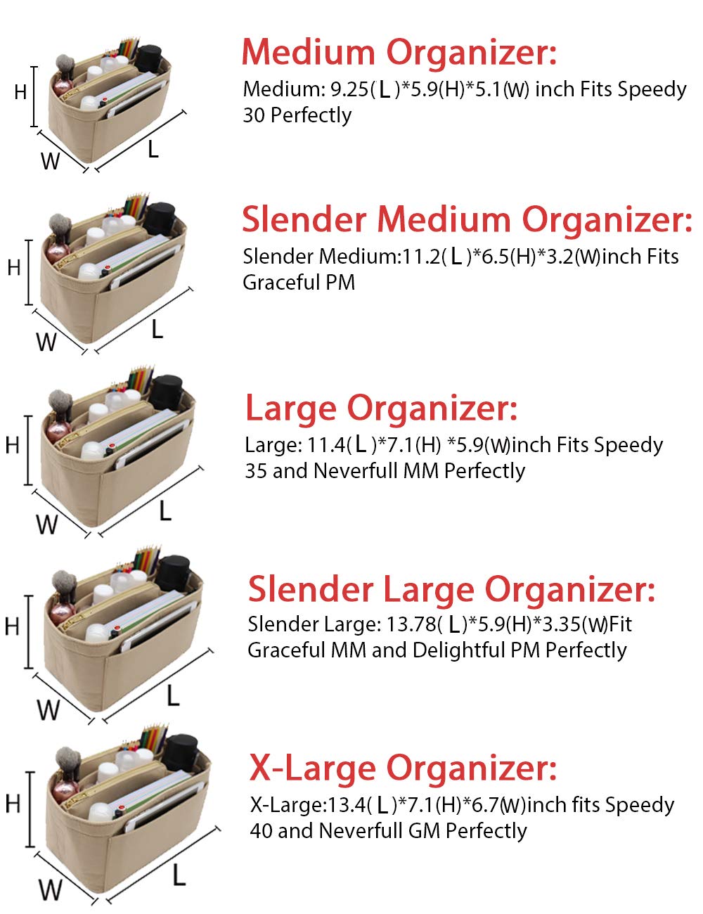 SIZE OF BAG ORGANIZER: Medium: 9.25(L)*5.9(H)*5.1(W) inch Fits Speedy 30 Perfectly. Slender Medium: 11.2(L)*6.5(H)*3.2(W)inch Fits Graceful PM. Large: 11.4(L)*7.1(H) *5.9(W)inch Fits Speedy 35 and Neverfull MM Perfectly. Slender Large: 13.78(L)*5.9(H)*3.35(W)Fit Graceful MM and Delightful PM Perfectly. X-Large:13.4(L)*7.1(H)*6.7(W)inch fits Speedy 40 and Neverfull GM Perfectly. Portable and Compact Purse Perfectly For any Brand.L*H*W means (Length*Height*Width)