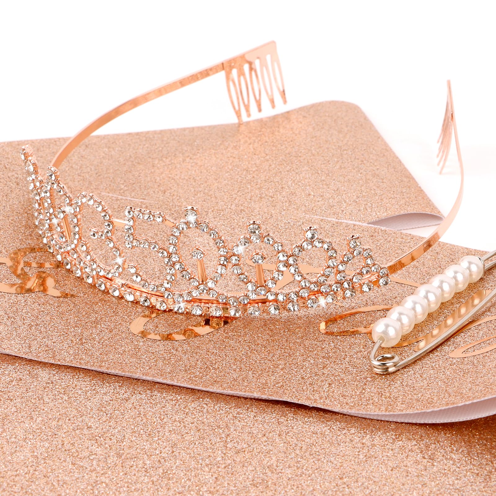 One Size Fit All - Birthday sash - Length: 62” (155cm), Width: 3.7” (9.5cm); Rhinestone tiara are adjustable as well comes with comb design that can holds and stable and comfortable on top of the hair. Birthday sash can be fixed and adjusted in length with pearl pins.