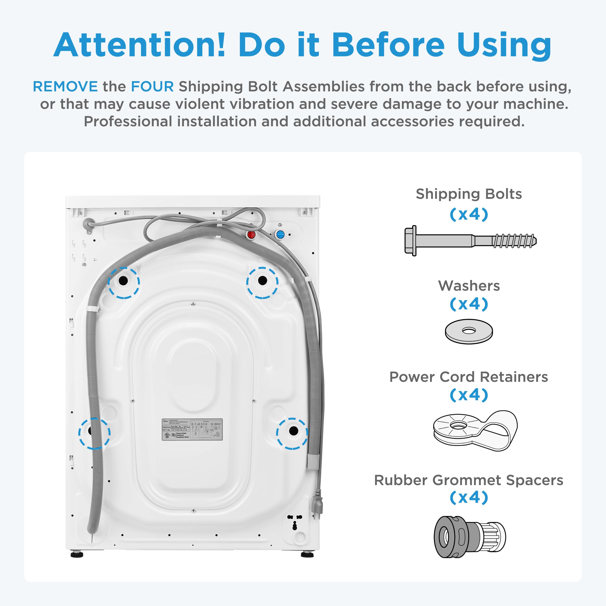 【Overnight Wash & Dry】Convenient overnight wash and dry cycle. Do your laundry at night and wake up to clean and fresh clothes in the morning. To prevent moving and shaking, REMOVE transport bolts before using. Defult time for Dryer program is 4-hour and Wash&Dry Program is 6-hour