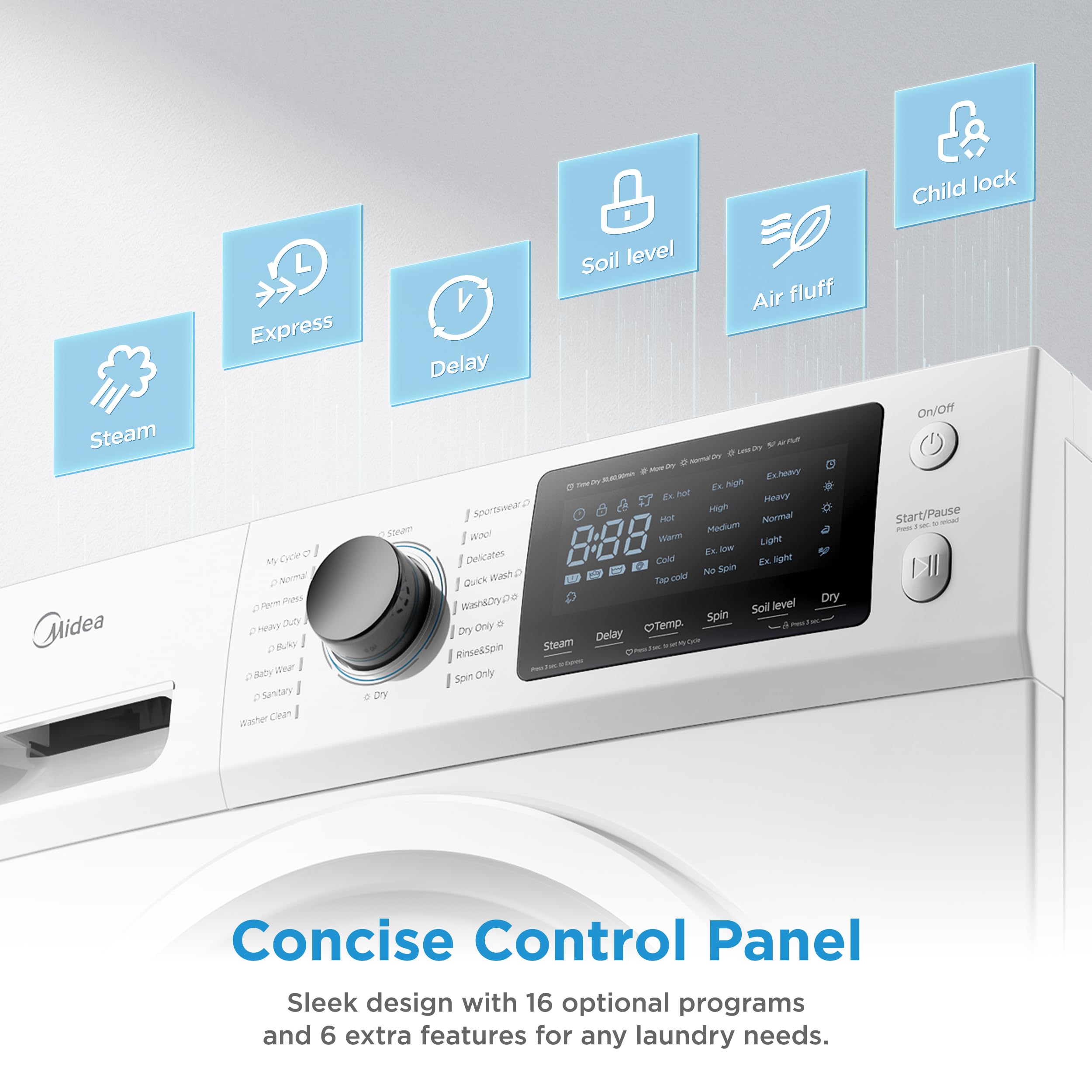 【Wash and Dry in One】Say goodbye to transferring loads and do your laundry in one machine. Midea's all-in-1 Ventless Washer and Dryer Combo has multi modes to meet different washing and drying demands - steam care, overnight wash and dry, reload function, quick wash, washer clean, air fluff.