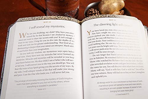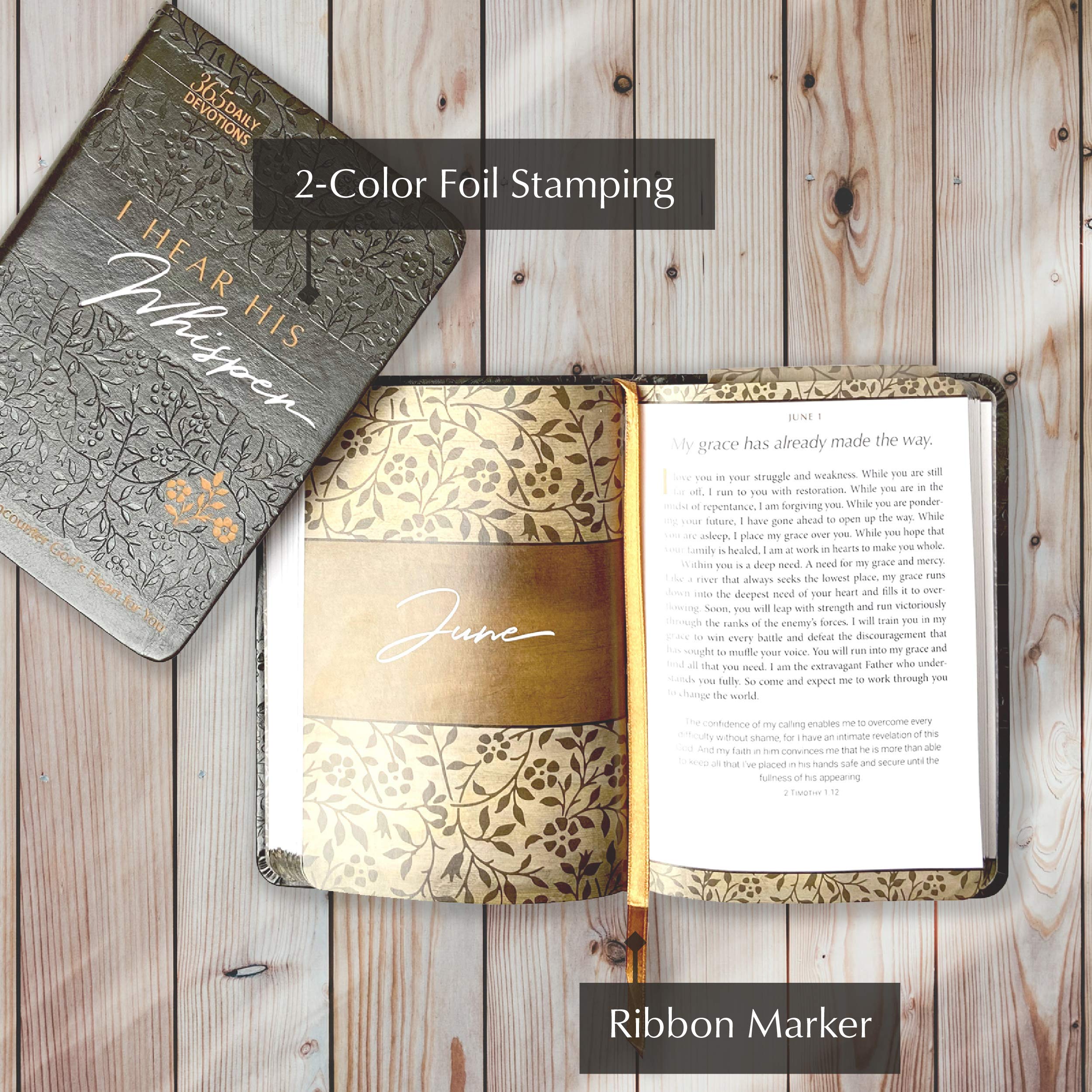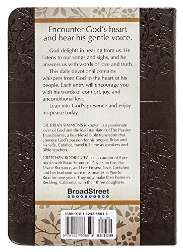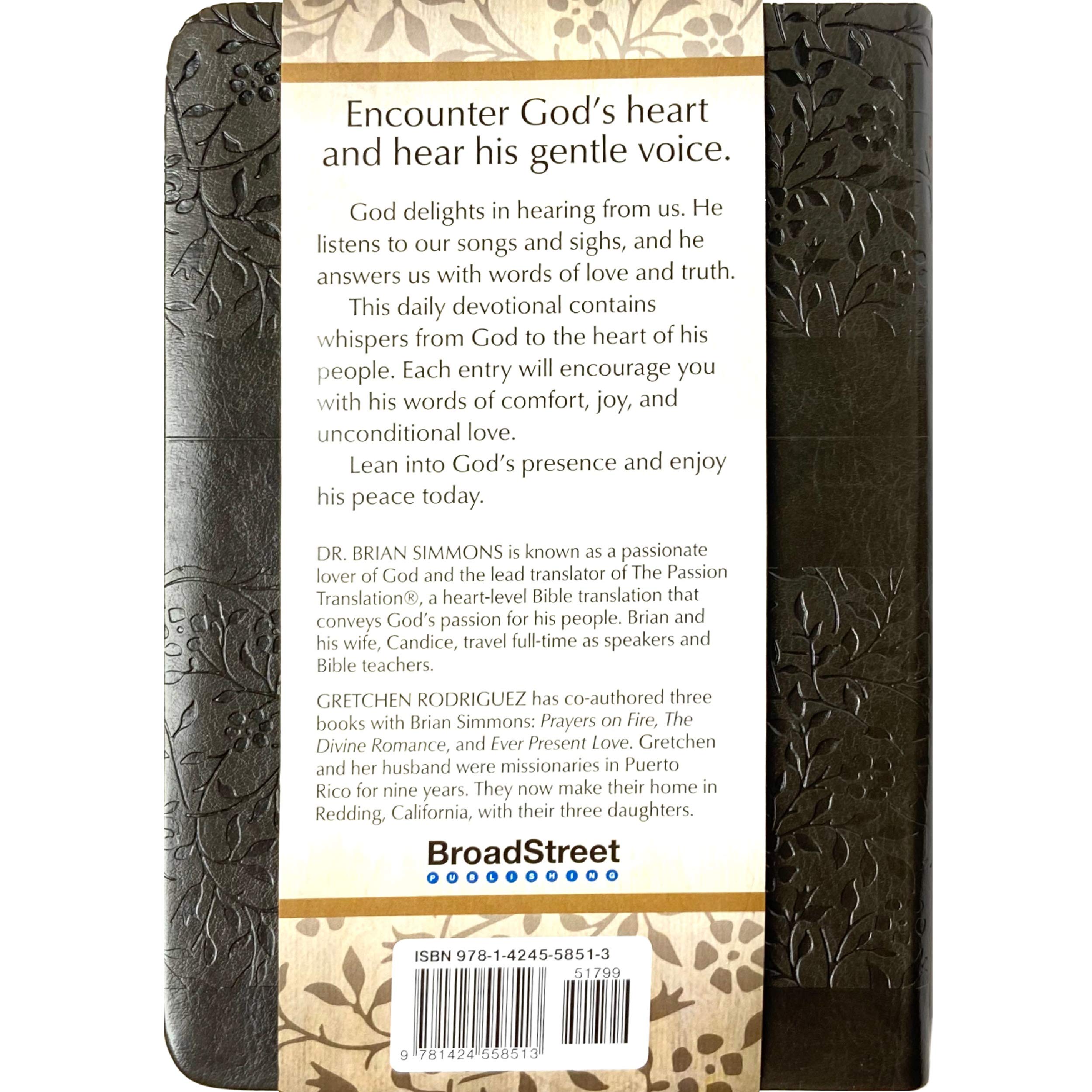 Encounter God's heart and hear his gentle voice. We love and serve a God who delights in hearing our voices. He hears our songs and sighs, and he answers those who seek him with whispers of love and truth. I Hear His Whisper is a daily devotional that contains messages of God's love for his people as spoken to the hearts of Dr. Brian Simmons, the lead translator of The Passion Translation®, and author Gretchen Rodriguez. Each day, a devotion and Scripture will encourage you to listen to God as he speaks words of comfort, joy, and unconditional love into your heart. Lean into God's presence and enjoy his peace, today and every day. Excerpt: I want every part of you to be free. I want you to be one with me. You’ve known this. You’ve aimed to let this be the theme of your life—living in union with me—but you have been neglecting one area. In order for you to truly be one with me, you must allow yourself to be fully consumed with me. Fully consumed—spirit, soul, and body. That means not only is your spirit aware of me and sensing my presence, but so is your soul, and ultimately your body. Today, I remind you that I want every part of you to be free. The issue is that when your mind is consumed with your problems, you’re not experiencing the fullness of my love. I want you to find true freedom in complete oneness with me. So let your mind come into agreement with me. Trust me and completely resign your will to mine. Release those cares into my hands. Either you can be in control of them or I can. But if you let me have control, you will finally experience the freedom and unity with me that you desire. You’ll finally have peace. The mind-set of the flesh is death, But the mind-set controlled by the Spirit finds life and peace. ROMANS 8:6 Key Features: Perfect gift for communion, confirmation, Easter, and more. Binding: Imitation Leather Pages: A convenient carry size at 384 pages. Publisher: BroadStreet Publishing Group, LLC Faux leather - High-grade faux leather provides durability and exquisite tactile appeal. Heat debossing - Heat debossing on faux leather darkens its color, giving the cover a two-tone appearance and creating indentation which shows off the intricate design and varied texture. Foil stamping - Metallic foil finishing touches are elegantly placed to enhance certain features, capturing attention and adding class for an aesthetic appeal. Smythe-sewn binding - This high-quality sturdy binding stitches book signatures together creating durability and allowing pages to lay flat when open. Decorative head and foot bands are also added to further complement the binding. Interior paper - This matte art high quality paper with a smooth satin touch provides long-lasting vivid coloration and durability. Ribbon marker - A beautiful satin ribbon marker will conveniently keep your place so that you can quickly pick up where you left off.